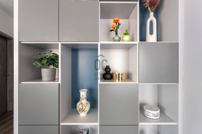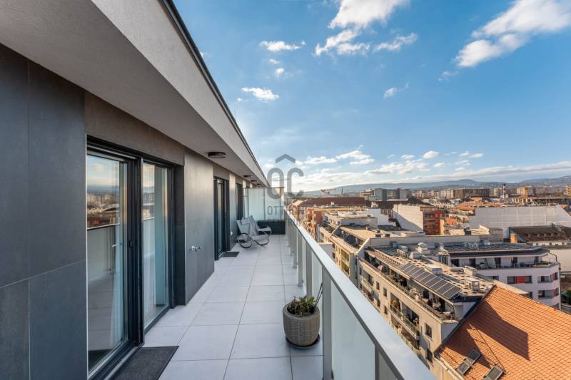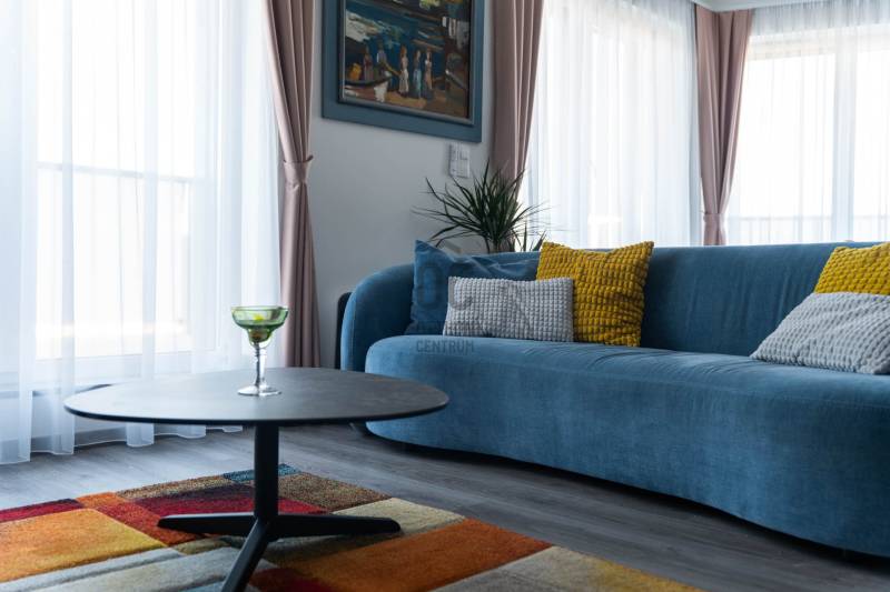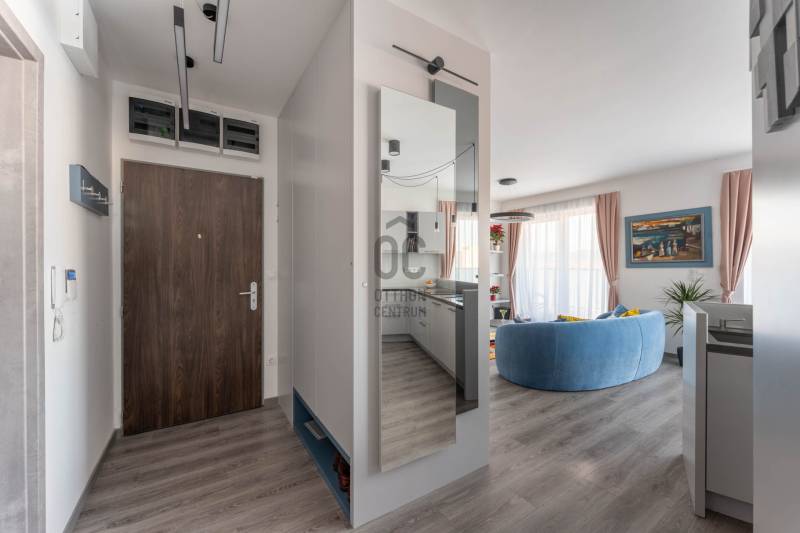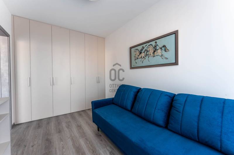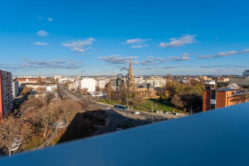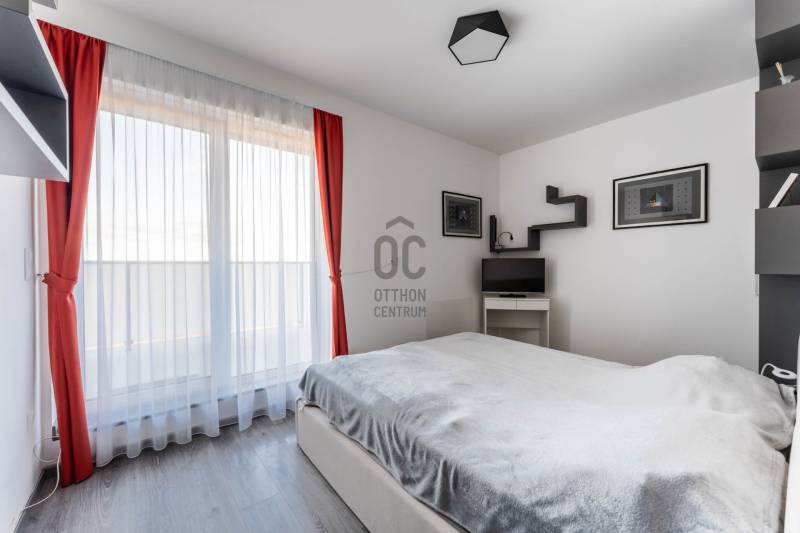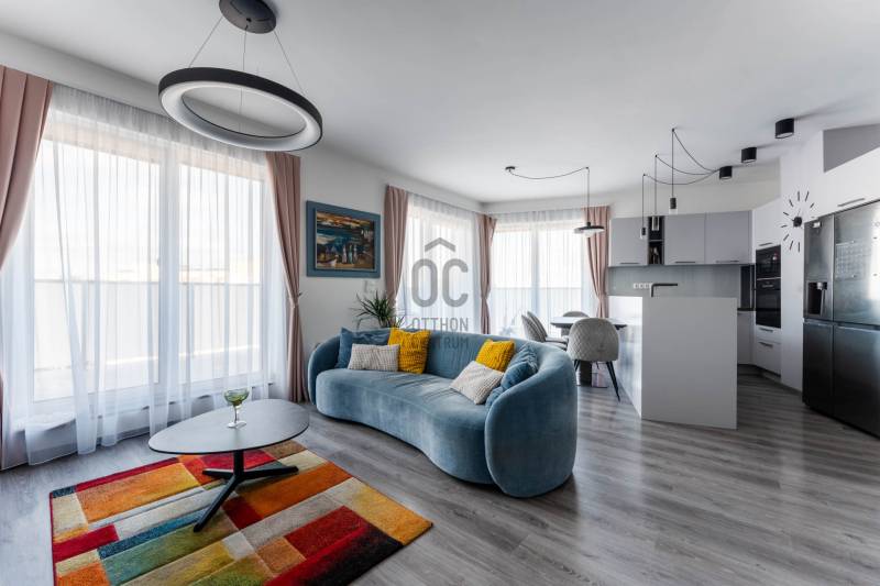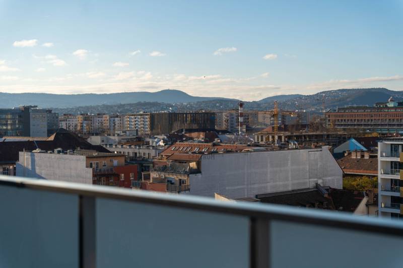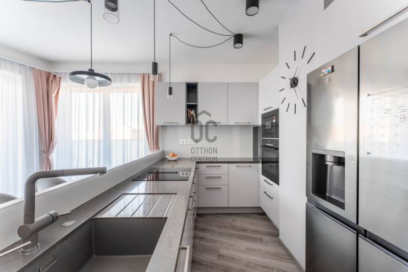 Minden nap ugyanaz a kérdés: miért nem költöztél ide előbb? Üdv itthon!RÖVID ÖSSZEFOGLALÓ Budapest XIII. kerületében, Angyalföld egyik legújabb fejlesztésében, a 2023-ban átadott Béke Residence-ben található ez a 70 m²-es, nappali + két hálós penthouse lakás, 44 m²-es, teljes hosszban futó terasszal és elvehetetlen panorámával a Budai Várra, a Normafára és a Szent László templomra.A 9. emeleti otthon teljesen bútorozott, tehermentes, mennyezeti hűtés–fűtés rendszerrel működik, és azonnal költözhető.A lakáshoz garázs és tároló tartozik, melyek együtt 15 M Ft-ért vásárolhatók meg.A közös költség 34 000 Ft.ELHELYEZKEDÉS – XIII. KERÜLET, BÉKE TÉRAngyalföld ezen része olyan környék, ahol elsőre feltűnik a rendezettség: széles utcák, sok fény, átlátható terek és egyfajta természetes könnyed ritmus, amibe gyorsan beleszeret az, aki itt él. Nem túl zsúfolt, nem túl zajos — inkább olyan, ahol a városi lét előnyei és az otthonos környezet közti egyensúly magától értetődő. A Rákos-patak sétánya pár perces távolságban indul, - mintha a városban nyílna egy rövid, zöld menekülőút: alkalmas egy gyors levegőzésre munka után, egy kis biciklizésre a gyerekekkel, vagy akár egy hétvégi kellemes sétához ebéd után. A Béke téri park és a Rokolya játszótér a helyiek számára biztos pont — ott mindig történik valami, gyerekzsivaj, mozgás, élet.Bevásárlásnál sem kell kompromisszumot kötni: a Lidl, Aldi, Spar, DM vagy Rossmann mind perceken belül elérhetők, a Lehel Csarnok pedig rövid autóúttal kapcsol a város egyik legjobb piacához. A Fáy utcai piac külön fejezet: szombatonként sajátos kerületi hangulat tölti meg, friss termelői áruk és ismerős arcok keverékével.A sportolási lehetőségek kifejezetten jók: a Vasas pályái, a Tichy Lajos Sportcentrum vagy a Kaffka Margit téri szabadtéri fitneszpark mind olyan helyek, amelyek megkönnyítik, hogy a mozgás ne hétvégi projekt legyen, hanem része maradjon a napi ritmusnak.Közlekedni egyszerű: a 14-es villamos két perc séta, és gyorsan összeköt a Váci úttal. A buszjáratok a Westend és a Nyugati felé visznek pár megálló alatt, a Lehel téri metró pedig rövid autóúttal elérhető. Innen elindulni és ide visszaérkezni is könnyű — talán ez az egyik legnagyobb előnye a Béke térnek, hogy minden úgy van közel, ahogy jólesik.AZ ÉPÜLET – MODERN, LETISZTULT, BIZTONSÁGOSA Béke Residence egy friss, modern épület: átgondolt közös terekkel, tágas liftekkel, jól kialakított garázsszinttel és kamerarendszerrel. A homlokzat letisztult, a lépcsőház világos, a lakóközösség igényes. Hangulatos, modern, rendezett ház, fiatalos és értéktartó — jó érzés megérkezni.ÚJ OTTHONOD BELSŐ VILÁGA Már az előszoba is jelzi, hogy itt minden részlet összehangolt. A szürke és kék árnyalatok visszafogott eleganciája végigkíséri az egész lakást, a mozgásérzékelős LED fények pedig diszkrét ritmust adnak a tereknek.A nappali a lakás legnyitottabb pontja: nagy üvegfelületein át folyamatosan érkezik a természetes fény, amely könnyed, levegős hangulatot ad a térnek.Napközben szinte észrevétlenül válik eggyé a lakás a terasszal; a két helyiség közötti átmenet olyan természetesen működik, mintha a külső és belső tér határai elmosódnának.Középen az Olaszországból érkezett pet-proof kanapé áll, első pillantásra is minőségi darab, használat közben pedig pontosan annyira kényelmes, amennyire várnád. Mellette az infinity bárszekrény és a borhűtő tesz hozzá egy visszafogott, mégis karakteres részletet; olyan funkcionális kiegészítők, amelyek idővel válnak az otthon kedvenc pontjaivá.A tárolókapacitás rendkívül erős: 30–40 pár cipő elhelyezésére alkalmas rendszer, ruhaliftes szekrények és több, padlótól plafonig futó beépített gardrób gondoskodik arról, hogy minden rendszerezve maradjon – ezek a megoldások a lakás praktikus oldalát hangsúlyozzák, és hosszú távon is hatalmas előnyt jelentenek. Letisztult, modern hangulat fogad a fürdőben: a nagyméretű szürke burkolatok nyugodt, rendezett hátteret adnak, a fehér szaniterek pedig tiszta kontrasztot teremtenek. A beépített kád kényelmes méretű, fölötte üvegfallal elválasztott zuhanykeret ad praktikus pluszt, így a helyiség két funkciót is gond nélkül kiszolgál.A mosdópult fekete felülete elegáns, a fali tárolók pedig elrejtik a mindennapi eszközöket, ettől marad a tér vizuálisan könnyű. Kényelmes részlet a törölközőszárítós radiátor, amely a hűvösebb napokon gyors melegedést biztosít, a szoba teljes ritmusa pedig olyan átgondolt, hogy könnyű benne elindítani vagy éppen lezárni a napot.A konyhában a TechniStone munkapult stabil, letisztult felülete adja a magabiztos alapot, amely jól bírja a mindennapi rutint. Beépített Bosch gépek dolgoznak csendesen és megbízhatóan, a konyha elrendezése pedig úgy lett kialakítva, hogy tényleg kézre álljon minden.A nappalira nyitott étkező természetes átmenetet képez a terek között; ez az a rész, ahol a napok ritmusában helyet kapnak a gyors reggelik, a nyugodtabb családi vacsorák és az elnyúló esti beszélgetések is.A lakás két hálója külön életet él, még ha nem is azonos mértékben szeparáltak. A terek elrendezése jól átgondolt: az egyik háló a központi nappali folytatása, a másik pedig ettől távolabb, a lakás csendesebb oldalán helyezkedik el. Ez a finom elválás biztosítja, hogy mindkét szoba valódi saját funkciót kaphasson.A nagyobb háló az otthon nyugodtabb, intim részén található. Pasztell árnyalatai miatt meleg és barátságos, a falra helyezett festmény pedig karaktert ad a térnek. A beépített, padlótól plafonig futó szekrények rendezett keretet