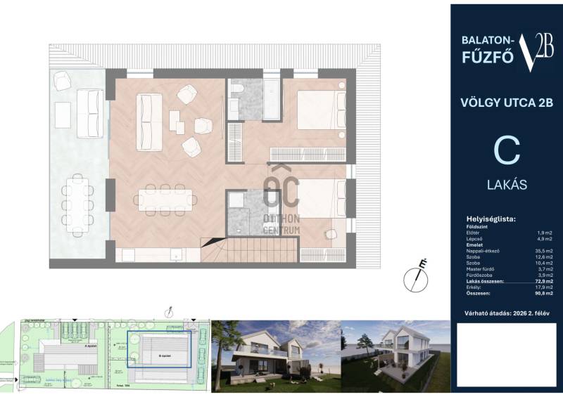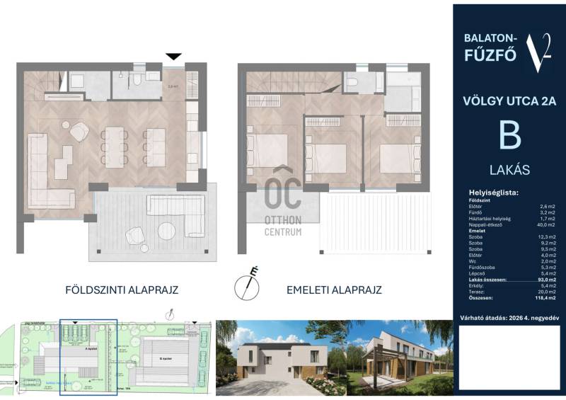 (2026-IV.) V2AB ikerház fél: 76,2 m² lakótér + 28 m² erkély és terasz, saját kerttel, 119,9 MFt,250 m a Fövenyfürdő strandtól és a kikötőtől,5 lakás épül - kis lakásszámú fejlesztés - két épületben, ebből még 3 lakás elérhető.Földszinti elosztás – jól átgondolt terekkel:-előtér gardróbhellyel (2,6 m²) és belső, privát lépcső (5,4 m²),-tágas, egy légterű nappali–konyha–étkező (40,0 m²) közvetlen (20,0 m²) teraszkapcsolattal, amely délnyugati erkélyre/teraszra nyílik, kiváló helyszín családi vacsorákhoz, napozáshoz, baráti összejövetelekhez.-háztartási helyiség (1,7 m²), -külön fürdőszoba (3,2 m²).Emeleti elosztás – jól átgondolt terekkel:-3 kényelmes hálószoba (12,3 m² és 9,2 m² és 9,5 m²),-külön fürdőszoba (5,3 m²),-előtér (4,0 m²),-WC (2,0 m²),-erkély: (5,4 m²).Parkolóhely:-udvari beállóhely: (2db) külön megvásárolható (3,0 Mft.)Műszaki tartalom – alacsony rezsi, magas komfort:„A” energetikai besorolású, hőszivattyús rendszerrel,Felület fűtés–hűtés minden helyiségben,Választható, minőségi burkolatok és szaniterek,Téglafalak kívül-belül, korszerű, szigetelt nyílászárók, nappaliban emelő-toló ajtó,Szigetelt falazat és tető, elektromos redőny előkészítéssel,A műszaki megoldások hosszú távon kiszámítható, energiahatékony fenntartást biztosítanak, így a lakás kiváló választás állandó otthonnak.Finanszírozás, környezet, parkolás:A lakás CSOK igénybevételére alkalmas,Kedvező finanszírozási konstrukciókkal megvásárolható, Balatonfűzfő teljes infrastruktúrával rendelkező, élhető város kevesebb mint 1 órára Budapesttől, Környezetében boltokkal, éttermekkel, vasútállomással rövid sétatávolságon belüli partszakasszal,A telken belül gépkocsi-beálló vásárolható.Elérhető lakások a fejlesztésben:V2BC (ez a lakás): 72,9 m² lakótér + 17,9 m² délnyugati terasz, emeleti lakás, 99,5 MFt,V2AB ikerház fél: 76,2 m² lakótér + 28 m² erkély és terasz, saját kerttel, 119,9 MFt,V2AA ikerház fél: 93,0 m² lakótér + 25 m² erkély és terasz, saját kerttel, 129,9 MFt.Akiknek ajánljuk:Az ingatlan ideális választás mindazoknak, akik a Balaton partján keresnek modern, napfényes, jól kihasználható terekkel rendelkező otthont – akár életvitelszerűen, akár nyaralóként vagy befektetésként.Projekt bemutatásaElérhető lakások a fejlesztésben:V2BC (ez a lakás): 72,9 m² lakótér + 17,9 m² délnyugati terasz, emeleti lakás, 99,5 MFt,V2AB ikerház fél: 76,2 m² lakótér + 28 m² erkély és terasz, saját kerttel, 119,9 MFt,V2AA ikerház fél: 93,0 m² lakótér + 25 m² erkély és terasz, saját kerttel, 129,9 MFt.250 m a Fövenyfürdő strandtól és a kikötőtől,5 lakás épül - kis lakásszámú fejlesztés - két épületben, ebből még 3 lakás elérhető.Parkolóhely:-udvari beállóhely: (1db) külön megvásárolható (1,5Mft.)-udvari beállóhely: (2db) külön megvásárolható (3,0Mft.)-udvari beállóhely: (1db) külön megvásárolható (1,5Mft.)Műszaki tartalom – alacsony rezsi, magas komfort:„A” energetikai besorolású, hőszivattyús rendszerrel,Felület fűtés–hűtés minden helyiségben,Választható, minőségi burkolatok és szaniterek,Téglafalak kívül-belül, korszerű, szigetelt nyílászárók, nappaliban emelő-toló ajtó,Szigetelt falazat és tető, elektromos redőny előkészítéssel,A műszaki megoldások hosszú távon kiszámítható, energiahatékony fenntartást biztosítanak, így a lakás kiváló választás állandó otthonnak is.Finanszírozás, környezet, parkolás:A lakás 3%-os Otthonfelújítási Hitel (Otthon Start) és CSOK igénybevételére alkalmas,Kedvező finanszírozási konstrukciókkal megvásárolható, Balatonfűzfő teljes infrastruktúrával rendelkező, élhető város kevesebb mint 1 órára Budapesttől, Környezetében boltokkal, éttermekkel, vasútállomással rövid sétatávolságon belüli partszakasszal,A telken belül gépkocsi-beálló vásárolható.Akiknek ajánljuk:Az ingatlan ideális választás mindazoknak, akik a Balaton partján keresnek modern, napfényes, jól kihasználható terekkel rendelkező otthont – akár életvitelszerűen, akár nyaralóként vagy befektetésként.