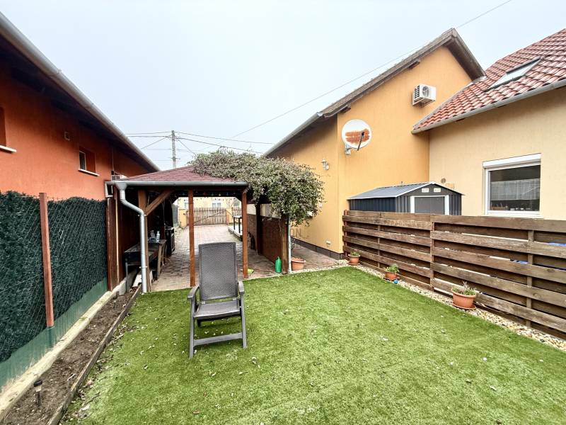 Ha olyan otthont keres, ami tényleg csak beköltözésre vár, ahol a minőség, a kényelem és a praktikum kéz a kézben jár, akkor ez a ház pont Önnek szól! Főbb paraméterek- 2007-ben épült, újszerű állapot- Nettó 118,66 m², bruttó 145 m²- Masszív építés, mindössze a fürdőnél közös fal az iker másik felével- 10 cm-es szigetelés- 550 m²-es, rendezett, jól használható telek- Földszinten padlófűtés (a szoba kivételével)- Emeleten radiátoros fűtés- Gázcirkó a fűtéshez és melegvízhez- 2 db vadonatúj, garanciális inverteres klíma (egy fent, egy lent)- Kiépített riasztórendszer (bekötés nélkül)- Mindenhol redőny, az emeleten reluxa- A konyha Bosch gépesítéssel, asztalos által méretre gyártott bútorzattal készültKülső extrák-12 m²-es terasz-Önálló, 8 m²-es kerti tároló-Fedett autóbeálló elektromos kapuval- Csendes, forgalomtól mentes környék — igazi béke szigete Közlekedés- Buszmegálló: 12 perc séta, 35 perc alatt az Örs vezér tere- Vasút: 2 km, 30 perc alatt Keleti pályaudvarAz ingatlan per- és tehermentes, hitelképes, az ügyintézésben segítséget biztosítunk! A HÁZ MINDEN BERENDEZÉSE a vételár részét képezi — ritka, nagy érték! Várom hívását akár a hétvégén is!Ez az ingatlan a \"Felező csomag\" megbízási portfólióhoz tartozik. Részletek az Otthon Centrum weboldalán.