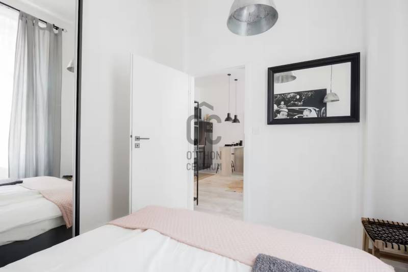 Kiadásra kínálok a VI. ker belső részének nyugodt utcájában egy nagyon szép és igen impozáns teljesen felújított belső és külső homlokzatú társasházban található 52 nm -es, remek alaprajzú N+ 2 hálós igényesen műszakilag és esztétikailag is teljesen felújított ingatlant, teljes bútorzattal együtt.Lássuk a részleteket:A VI. ker. belső részén, egyenlő távra az Andrássy úttól, az Oktogontól vagy a nyüzsgő VI. és VII. kerület határát is jelentő Király utcától egy kis nyugodt egyirányú utcában található az ingatlan.A klasszikus polgári épület külső homlokzata teljesen felújított - tükrözi a régi értékeket. Az épületbe lépve rendezettség fogad. A belső homlokzat és a kapuszín szintén felújított. A lakás a társasház II. emeletén található ide vagy lifttel vagy a szép szintén impozáns lépcsőházban jutunk fel.Az ingatlan teljes műszaki felújításon esett át ( ez magában foglalt mindent ) - a fotók magukért beszélnek!A lakásban egy kellemes méretű amerikai konyhás nappali kapott helyet, illetve egy kisebb és egy nagyobb hálószoba. Az egyik hálóhoz az alaprajzon is látható módon egy kis aranyos gardrób is tartozik. A beérkezésnél elég a tér, és itt is világos a lakás. Van elég hely lepakolni, megérkezni. Az amerikai konyhás nappali utcára néz, de mivel az utca csak egyirányú nagyon csendes. A képeken is látható, hogy gépesített konyha ( mikró, sütő, elszívó, főzőlap, mosogatógép stb. ) . A kellemes méretű nappaliban kis étkező, pihenő sarok és nappali rész lett kialakítva. Innen nyílik a nagy háló, melyben nagy méretű világítással is felszerelt gardrób szekrény kapott helyet. A fürdő is minden igényt kielégít - végre nem kell dönteni, hogy kád vagy zuhany, ugyanis mindkettő van! Kézmosó, mosógép és törölközőszárító is kellemesen elfér itt. A WC külön van a fürdőtől.Az ingatlan fenntartása nagyon kedvező.Az ingatlant egyedi, gáz cirkó kazán fűti, a hidegről klíma gondoskodik, gázóra, vízóra és villanyóra is van. A kktg. 21.415 Ft.A lakáshoz tartozik a pincében egy önálló tároló, mely 6 m2.Várom hívását, rugalmasan megtekinthető nagyon szép ingatlan. Keressen nyugodtan!