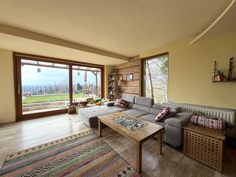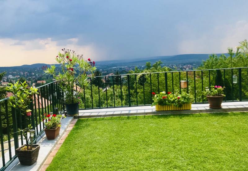 Ritka lehetőség a piacon: állandó panoráma, teljes nyugalom, mégis mindössze 15 percre Budapesttől!Ez a 150nm-es világos, tágas otthon Budakeszi legszebb részén helyezkedik el, ahol sem autóforgalom, sem szomszédzaj nem zavarja a mindennapokat.Otthon, ahol egész nap süt a nap.A nappali, a terasz és a hálószobák egész nap természetes fényben fürdenek.A 60 nm-es terasz egy része füvesített, automata öntözőrendszerrel felszerelt, igény esetén jakuzzi is telepíthető, így saját privát wellness-szigeted lehet.Ősztől tavaszig a teraszról és a nappaliból páratlan naplementékben gyönyörködhetsz.Környezet és közlekedés:A környék csendes, zöldövezeti, igazi kis sziget a város mellett.A buszmegálló 5 perc sétára található, a Budapest-bérlettel használható járatok 5 percenként közlekednek, így a főváros gyorsan és kényelmesen elérhető, dugóállás nélkül, mindkét irányban.Műszaki állapot:•A ház 2007-ben társasházzá nyilvánított, 2019-ben teljes felújításon és 12 cm-es szigetelésen esett át•Szintek teljesen elszeparáltak, saját bejárattal és külön helyrajzi számmal•A telek adottsága miatt a szomszédokkal gyakorlatilag nem lehet találkozni•Fa, dupla üvegű nyílászárók•Viessmann kondenzációs kazán•Alacsony rezsi: fűtés ~15.800 Ft/hó, áram ~5.700 Ft/hóKert és parkolás:•A lakáshoz kb. 200 nm saját kert tartozik•Emellett 702 nm közös, gondozott kert is rendelkezésre áll, gyümölcsfákkal, virágokkal, sütögető hellyel•Ingyenes utcai parkolás, saját beállón•Extra: 1 év ingyenes parkolóhely a pár perc sétára található teremgarázsban (a vételár része!)Infrastruktúra:•DM, Coop, pékség, éttermek, park és játszótér (10 perc séta)•Két irányban 5 perc alatt cukrászdák, kávézók•Kiváló óvodák, iskolák (állami és magán), erdei és parki játszóterek•Közeli védőnői, gyermekorvosi és felnőtt orvosi központ•Kedves, összetartó, segítőkész lakóközösségKinek ajánljuk?Tökéletes választás:✔ családoknak✔ külföldről hazatelepülőknek✔ befektetőknekakik exkluzív, panorámás, nyugodt otthont keresnek közel Budapesthez.Gyors 30 napos birtokbaadás! Rugalmasan megtekinthető, további információért és megtekintési időpontért hívjon!