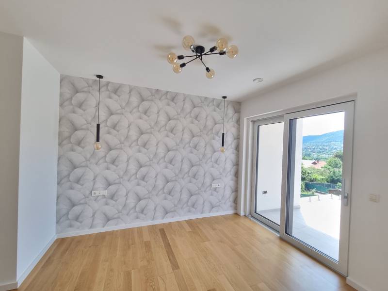 3.ker, Aranyhegyen, jól megközelíthető helyen aszfaltos utcában, panorámás , PRÉMIUM katgóriás 170 m2-es, nappali + 4 szobás +2 félszobás családi ház, nagy múltú beruházótól , dupla garázzsal eladó.A telken 3 db külön álló , szeparált családi ház található.A teljes ház prémium anyagokkal lett megépítve, mind a külső mind a belső tekintetében.Belső építész által tervezett koncepció alapján kerültek kiválasztásra a kiváló minőségű burkolatok, prémium szaniterek és egyedi gépesített konyhabútor.A ház teljesen elkészült, azonnal költözhető. Használatbavétellel is rendelkezik.Az ingatlan fekvése délnyugati, így egész nap világos.Földszinten található:Előtér, vendégszoba/dolgozószoba, zuhanyzó, gépészet-mosókonyha, amerikai konyhás nappali.Emeleten:Közlekedő, 1 master bedroom saját fürdővel és gardróbbal, 2 további hálószoba, 1 fürdőszoba.A ház paraméterei:- nettó lakótér: 131m2- teraszok: 42m2- dupla garázs: 36m2 (benne van az árban)Műszaki tartalom:- Gépészet: hőszivattyú, melegvíz tartállyal, mennyezet fűtés és hűtés, padlófűtés.- Szellőztető rendszer, párásítással és szárító funkcióval.- Vízlágyító.- Konyhai szellőzés tető fölé vezetve.- Elektromos törölköző szárító radiátoroknak kiépítés.- Kertben kerticsapnak kiállás.- Szülői háló teraszán elektromos és gépészeti kiállás jakuzzinak.- Okosotthon rendszer kiépítve. TAP Home rendszer.- Külső elektromos kiállások.- Hofstädter prémium ablakok és bejárati ajtó, zsalúzia minden ablakon.- Prémium belső burkolatok, a parketta mindenhol szalagparketta (Bécsi parketta) – nem laminált.- Belső nyílászárók valódi fa furnérozott ajtók (Porta door), nem fóliázott ajtók.- Szaniterek (kád, zuhany, mosdók, wc-k), prémium márkák (Grohe, Ravak), a mosdószekrények is beépítésre kerültek.- A riasztó rendszernek kiépítve a kábelezése, a nyílászárókban nyitásérzékelő kiépítve.- Teraszokon Üvegkorlát került elhelyezésre mindenhol.- Az összes belső lámpa beépítésre került.- A konyha is beépítésre került, a hűtő kivételével az összes gépet is tartalmazza.- Külső homlokzatra Travertin és Antracit Brazil pala kőburkolat került felhelyezésre.- 15 cm – grafitos hőszigetelés a falakon és erkélyeken.- Tetőn 22cm + hőszigetelés. A padló alatt 12 cm hőszigetelés.A kiváló energetikai tulajdonságoknak köszönhetően az üzemeltetési költségek rendkívül alacsonyak!VÁROM HÍVÁSÁT, AKÁR HÉTVÉGÉN IS, MINDEN NAP REGGEL 8-TÓL ESTE 10-IG.
