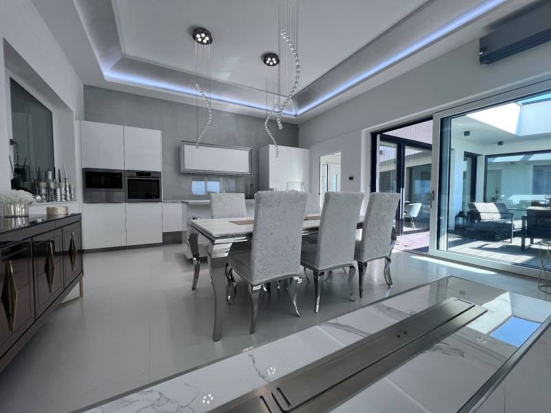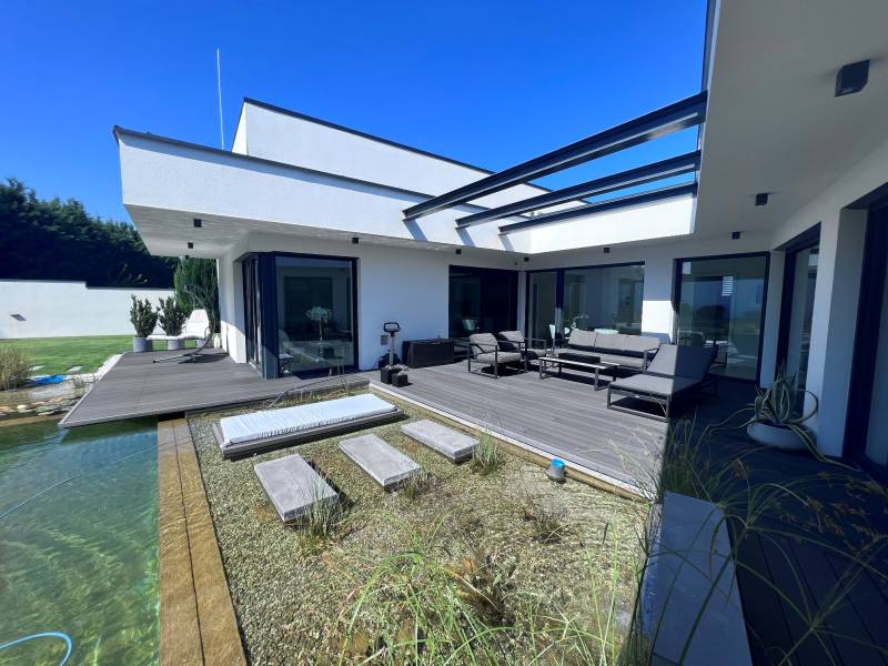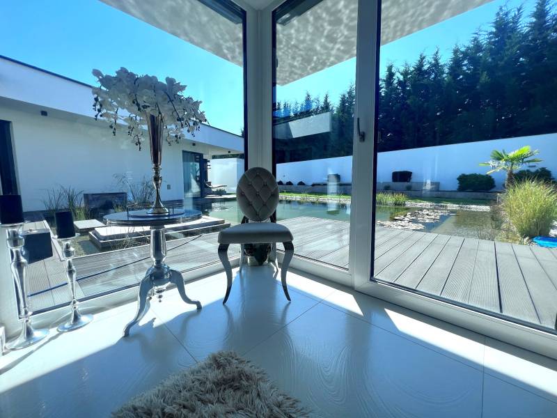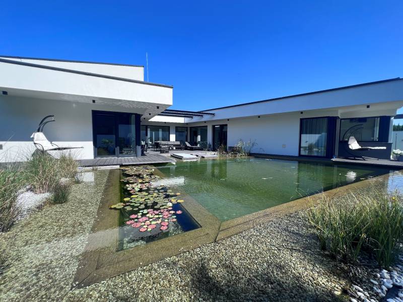 Megvételre kínálunk, egy újszerű, kompromisszummentes, kiváló adottságokkal rendelkező, egyszintes, minimalista jegyekkel épült, 220 nm- alapterületű, nappali+3 hálószobás modern családi házat kétállásos garázzsal.A Lake Forest villaparkot egy Magyarországon egyedülálló vízió hozta létre, mégpedig egy erdő közepén elterülő letisztult és mintaszerű Modern családi házas környezet, a Villapark közepén kialakított 7000 nm-es dísztóval.A ház gondosan megtervezett, mind külső jegyei, mind a belső enteriőr vonzza a tekintetet. Prémium minőségű, építészeti megoldások mellett, magas műszaki tartalommal épült, a praktikum és az elegancia ihlette.A házról:A házba lépve már az előtérben szemet gyönyörködtető, az üveg felületeknek köszönhetően elénk táruló, a házat körülvevő privát kert és Bio tó. Az előtérből jobbra található az Amerikai konyhás nappali, szintén körbe üveg felülettel, egyedi gyártású, teljesen gépesített, prémium minőségű konyhabútorral. Az étkezőasztal mögött kapott helyet egy Bioetanol beépített látványkandalló is, ami szeparálja a pihenő nappalit, a páratlan, saját tóra és teraszra tájolva. A nappali a hálószobáktól teljesen elkülönül, a gondos tervezésnek köszönhetően.Az előtértől balra a közlekedőn át található egy vendég wc, tovább a gardrób szoba, melyből nyílik egy tágas kádas, ablakos fürdőszoba wc-vel. A közlekedőn át haladva az üvegfelületeken át az egész kert és a tó is elénk tárul, miközben elérjük a két külön nyíló gyermekszobát, továbbá a mosókonyhát. A gyermekszobák és a szülői háló között található a dolgozószoba, majd a szülői háló, saját gardróbbal, privát terasszal és fürdőszobával. Minden szobája kertkapcsolatos, a kert intimitása teret ad az aktív pihenésnek, mindezeken túl tetőterasz is kialakításra került.Komfort:A házban a 2 fürdőszobán túl további vendég wc és zuhany is kialakításra került.Műszaki tartalom:A ház falazata, 30 cm-es Porotherm falazat amely 20 cm-es Austrotherm Grafit fokozott hőszigeteléssel lett ellátva. A ház építése során a munkafolyamatok dokumentálva lettek, bővebb műszaki tájékoztatással személyesen állunk szíves rendelkezésükre.A gépészet:A fűtés padló és falfűtéssel lett kialakítva, a helyiségekben inverteles klíma berendezések biztosítják a hűtést-fűtést, a ház központi vízlágyító és víztisztító rendszerrel lett kiépítve. 10.5 kw teljesítményű napelem rendszer biztosítja a ház energiatakarékos fenntartását.Luxus kategóriájú Olasz hideg burkolatok kerültek beépítésre a fürdőszobákban és a közlekedőn, valamint a nappaliban. A szobákban egyedi színre pácolt tölgyfa parketta került, prémium szaniterekkel, csaptelepekkel, egyedi gyártású nyílászárókkal.Kert :A hatalmas Telek, lehetőséget nyújtott egy csodás privát kert, kényelmes terasz modern WPC burkolattal, saját BIO tó, grill terasz bioklimatikus motoros, vízálló pergolával (mely körbe LED világítással van felszerelve), a házhoz kapcsolódó tároló épület, kialakítására. A telek V-alakú formájából adódóan a hátsó kert tágas, egyedi méretének köszönhetően kellően nyugodt magánszférát és intimitást nyújt az otthon eltöltött pihenésnél. Mára a zöld növényzet a dísznövények, a kert összképe magával ragadó, a Leendő Tulajdonosnak már csak a fenntartására kell energiát fordítania.A kert fenntartáshoz szükséges ROBOMOW önjáró fűnyíró és a Bio tó tisztításához szükséges DOLPHIN medence tisztító is a vételár részét képezik.Berendezés:Szinte a teljes berendezésre, bútorzatra a leendő tulajdonos igényt tarthat, már csak élveznie kell az új Otthona kényelmét.További felmerülő kérdéseivel forduljon hozzám bizalommal, megtekintés rugalmasan, előre egyeztetett időpontban.Ferge Imre