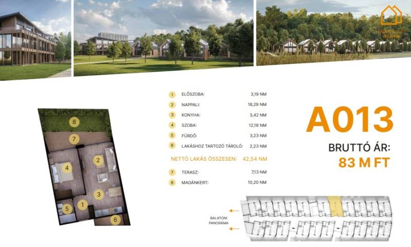 Balatonföldvár: Balatonföldvár fontos turisztikai célpont, nemcsak a magyarok, hanem más európai országok turistái számára is, természeti szépségei (például a löszhegy és a nagy virágos parkok), továbbá történelmi örökségei (például a kelta ösvény, a régi kúriák és villák) miatt számtalan szabadidős lehetőséget, valamint számos vízi sportot (vitorlázás, szörfözés, horgászat, evezés)Balaton liget willapark:Lakások száma: 56 db.Alapterület: 28-56 m².A földszinti lakásokhoz saját, privát kert tartozik.A földszinten 21 lakás található, 48–110 m² közötti alapterülettel.Az első emeleten további 21 lakás érhető el, 47–75 m² közötti méretben.A második emeleten 17 lakás kapott helyet.A lakásokhoz önálló tárolóhelyiségek tartoznak, amelyek a közös folyosóról közelíthetők meg.Környezettudatos építő anyagokA+ energetikai besorolásFelszíni parkoló: 6.350.000. Ft.Modern letisztult építészet, tömegformálás, Balatonra tájolt panorámás teraszok.Apartmanlakás - alapfelszereltség:100% tömör CLT Ausztriából.20 cm kőzetgyapot hőszigetelés.Fa hőszigetelő nyílászárók 3 rétegű üvegezéssel,tölgyfurnér melegburkolat.Porcelán greslap hidegburkolat, villeroy fürdőszoba szaniterekpadlófűtés.Levegős hőszivattyú (VRV splitklíma), 50kW társasházi napelemrendszer, elektromos redőny, szúnyogháló beépített bútoroksaját teraszKert: 10 nm.A 013. lakás.A további kérdésekkel és a megtekintéssel kapcsolatban kérem keressen a megadott mobil számon.