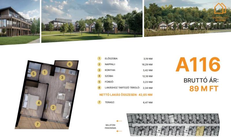 Balatonföldvár: Balatonföldvár fontos turisztikai célpont, nemcsak a magyarok, hanem más európai országok turistái számára is, természeti szépségei (például a löszhegy és a nagy virágos parkok), továbbá történelmi örökségei (például a kelta ösvény, a régi kúriák és villák) miatt számtalan szabadidős lehetőséget, valamint számos vízi sportot (vitorlázás, szörfözés, horgászat, evezés)Balaton liget willapark:Lakások száma: 56 db.Alapterület: 28-56 m².A földszinti lakásokhoz saját, privát kert tartozik.A földszinten 21 lakás található, 48–110 m² közötti alapterülettel.Az első emeleten további 21 lakás érhető el, 47–75 m² közötti méretben.A második emeleten 17 lakás kapott helyet.A lakásokhoz önálló tárolóhelyiségek tartoznak, amelyek a közös folyosóról közelíthetők meg.Környezettudatos építő anyagokA+ energetikai besorolásFelszíni parkoló: 6.350.000. Ft.Modern letisztult építészet, tömegformálás, Balatonra tájolt panorámás teraszok.Apartmanlakás - alapfelszereltség:100% tömör CLT Ausztriából.20 cm kőzetgyapot hőszigetelés.Fa hőszigetelő nyílászárók 3 rétegű üvegezéssel,tölgyfurnér melegburkolat.Porcelán greslap hidegburkolat, villeroy fürdőszoba szaniterekpadlófűtés.Levegős hőszivattyú (VRV splitklíma), 50kW társasházi napelemrendszer, elektromos redőny, szúnyogháló beépített bútoroksaját terasz.A 116. lakás.A további kérdésekkel és a megtekintéssel kapcsolatban kérem keressen a megadott mobil számon.