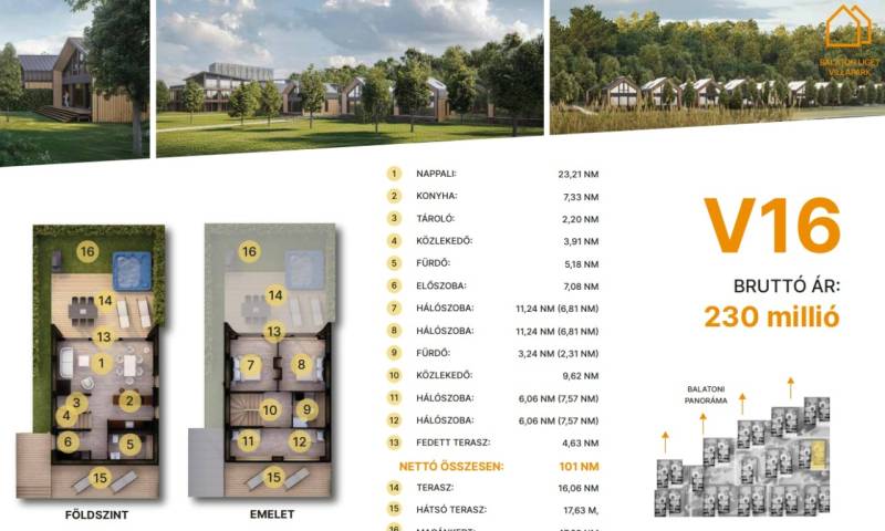 Balatonföldvár: Balatonföldvár fontos turisztikai célpont, nemcsak a magyarok, hanem más európai országok turistái számára is, természeti szépségei (például a löszhegy és a nagy virágos parkok), továbbá történelmi örökségei (például a kelta ösvény, a régi kúriák és villák) miatt számtalan szabadidős lehetőséget, valamint számos vízi sportot (vitorlázás, szörfözés, horgászat, evezés)Villák - kulcsrakész alapfelszereltség:100% tömör CLT Ausztriából.20 cm kőzetgyapot hőszigetelés.A+ energetikai besorolás.Fa hőszigetelő nyílászárók 3 rétegű üvegezéssel, tölgyfurnér melegburkolat.Porcelán greslap hidegburkolat.Villeroy fürdőszoba szaniterek,padlófűtés.Levegős hőszivattyú (VRV splitklíma), 2,5 kW napelem rendszer, elektromos redőny, szúnyogháló, beépített bútorok, homlokzati díszvilágítás.min. 33 m² teraszmin. 47 m² magánkert.Villák - választható opciók:Prémium konyhabútor konyhaszigettel, okosotthon rendszer, szauna (épületen belül), látvány design kandalló, 4 személyes prémium jacuzzi, gázos grillsütő.Privát zárt parkoló: 6.350.000. Ft.Privát elektromos autótöltő, kedvezményes hajóhely az új e-kikötőben.V.16.A további kérdésekkel és a megtekintéssel kapcsolatban kérem keressen a megadott mobil számon.