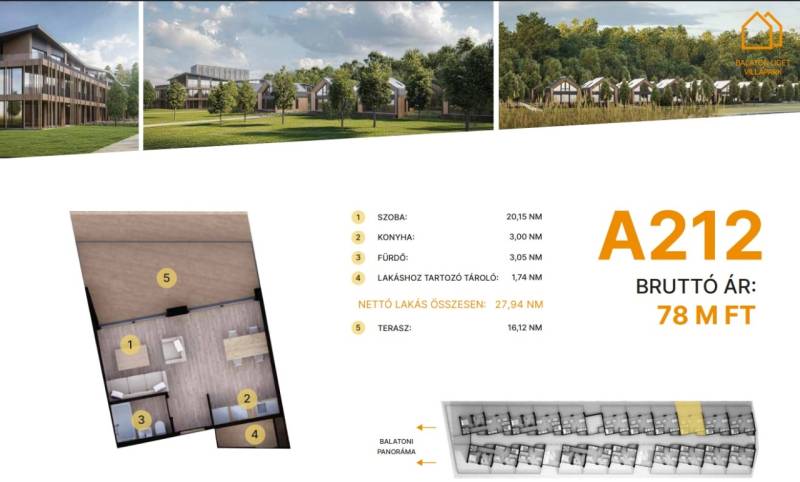 Balatonföldvár: Balatonföldvár fontos turisztikai célpont, nemcsak a magyarok, hanem más európai országok turistái számára is, természeti szépségei (például a löszhegy és a nagy virágos parkok), továbbá történelmi örökségei (például a kelta ösvény, a régi kúriák és villák) miatt számtalan szabadidős lehetőséget, valamint számos vízi sportot (vitorlázás, szörfözés, horgászat, evezés)Balaton liget willapark:Lakások száma: 56 db.Alapterület: 28-56 m².A földszinti lakásokhoz saját, privát kert tartozik.A földszinten 21 lakás található, 48–110 m² közötti alapterülettel.Az első emeleten további 21 lakás érhető el, 47–75 m² közötti méretben.A második emeleten 17 lakás kapott helyet.A lakásokhoz önálló tárolóhelyiségek tartoznak, amelyek a közös folyosóról közelíthetők meg.Környezettudatos építő anyagokA+ energetikai besorolásFelszíni parkoló: 6.350.000. Ft.Modern letisztult építészet, tömegformálás, Balatonra tájolt panorámás teraszok.Apartmanlakás - alapfelszereltség:100% tömör CLT Ausztriából.20 cm kőzetgyapot hőszigetelés.Fa hőszigetelő nyílászárók 3 rétegű üvegezéssel,tölgyfurnér melegburkolat.Porcelán greslap hidegburkolat, villeroy fürdőszoba szaniterekpadlófűtés.Levegős hőszivattyú (VRV splitklíma), 50kW társasházi napelemrendszer, elektromos redőny, szúnyogháló beépített bútoroksaját terasz.Kedvező fizetési konstrukció: 10-90 %.A 212. lakás.A további kérdésekkel és a megtekintéssel kapcsolatban kérem keressen a megadott mobil számon.