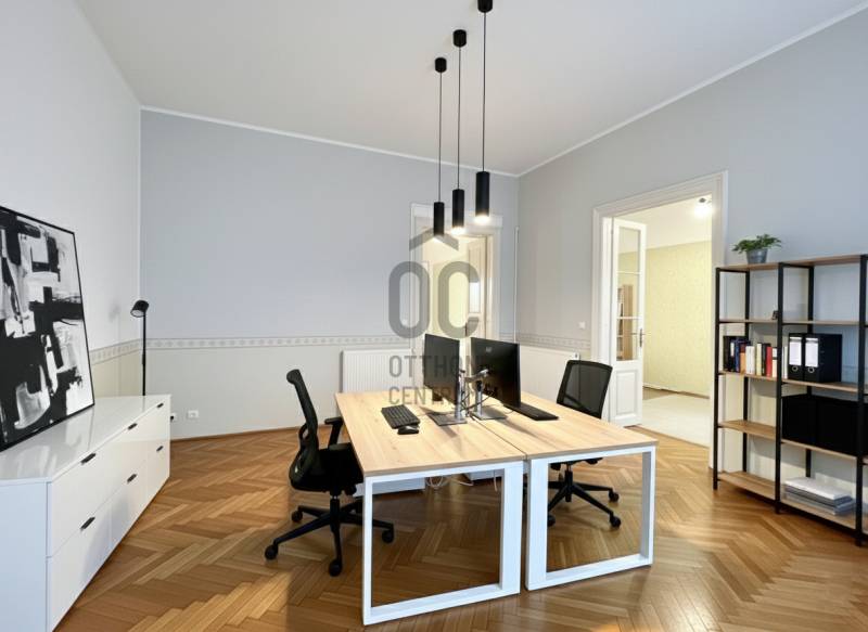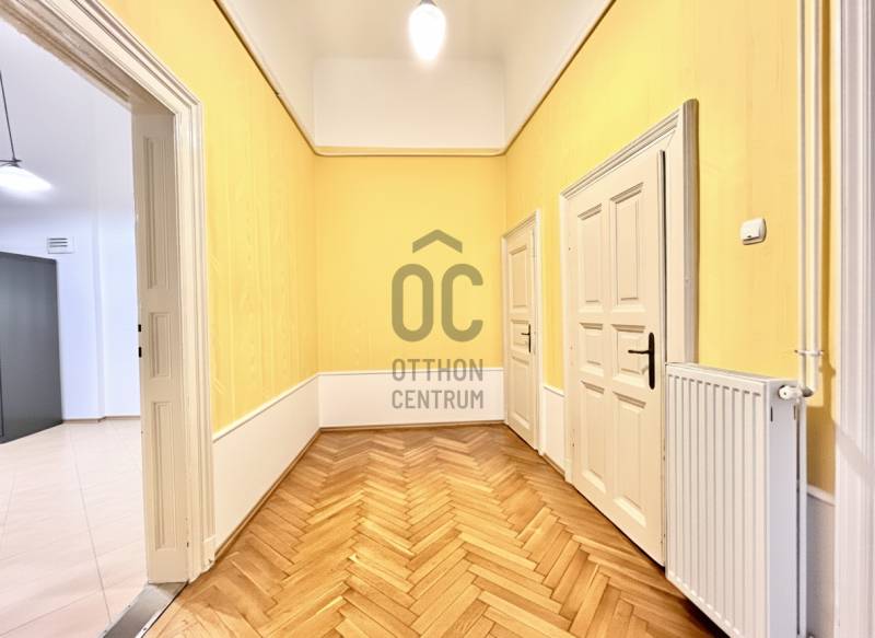 A belváros egyik legkeresettebb részén, a körúttól mindössze egy utcányira kínálunk megvételre egy 114 m² alapterületű, kiváló adottságokkal rendelkező polgári ingatlant, amely ideális választás irodai, egészségügyi vagy egyéb üzleti hasznosításra, de adottságainak köszönhetően galéria vagy exkluzív bemutatóterem kialakítására is alkalmas.A nagyvonalú, jól szeparálható helyiségek és az átalakítható alaprajz lehetővé teszik több iroda vagy rendelő kialakítását, illetve – megfelelő tervezéssel – akár két vagy három önálló egység létrehozását is. A tágas, reprezentatív terek és a jelentős belmagasság különösen alkalmassá teszik az ingatlant ügyfélforgalmat fogadó tevékenységre, bemutatótér, showroom vagy művészeti galéria működtetésére.Az ingatlan mintegy 20 évvel ezelőtt teljes körű műszaki felújításon esett át (villamoshálózat, víz- és csatornarendszer cseréje), néhány éve pedig korszerű gázkazán került beépítésre. Jelenlegi állapota jó, azonnal használatba vehető, ugyanakkor kiváló alapot biztosít egy modern, üzleti koncepció szerinti átalakításhoz.A nagy ablakfelületeknek köszönhetően a helyiségek kifejezetten világosak, ami irodai, egészségügyi vagy kiállítótéri funkció esetén egyaránt kiemelt jelentőségű. A természetes fény és a polgári karakter presztízsértéket képvisel, amely erősíti az ügyfélélményt és a márka megjelenését.A társasház rendezett, folyamatosan karbantartott, a közelmúltban megtörtént a fő víz- és csatornahálózat, valamint a fő gázvezeték cseréje is. Az ingatlanhoz tartozik egy kb. 7 m²-es, zárható saját tároló a száraz pincehelyiségben, levegőcserélő és páramentesítő rendszerrel – a belvárosban ritka és értéknövelő adottság.Az elhelyezkedés üzleti szempontból kiemelkedő: a körút közelsége kiváló megközelíthetőséget és frekventált környezetet biztosít. A Nyugati pályaudvar néhány perc sétára, az Oktogon 8–10 perc gyalogtávolságra található, az 1-es metró megállója szintén rövid sétával elérhető. A környék kiváló infrastruktúrával és tömegközlekedési kapcsolatokkal rendelkezik.Az ingatlan ideális választás ügyvédi iroda, könyvelőiroda, magánorvosi rendelő, egészségügyi vagy esztétikai központ, tanácsadó cég, oktatási központ, galéria, showroom vagy több egységből álló befektetési konstrukció kialakítására.(A terek jobb átláthatósága érdekében a hirdetési képeken a bútorzat eltávolításra került, továbbá néhány helyiség inspirációs jellegű látványtervként szerepel.)