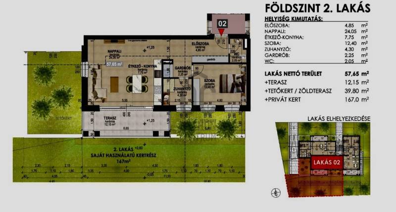 Debrecen egyik legkedveltebb és legértékállóbb városrészén, a Nagyerdő lábánál, eladásra kínálok egy 6 lakásos, modern társasházat, amely a minőséget, a letisztult eleganciát és magas műszaki tartalmat képvisel.Az ingatlan prémium kivitelezéssel, korszerű műszaki megoldásokkal és átgondolt tervekkel készül.A társasház nyugodt, csendes környezetben helyezkedik el, mégis kiváló infrastrukturával a Nagyerdő közelsége különleges életérzést biztosít.A földszinti lakások egyedi arculata a tágas nappali, melyet a teraszra nyíló hatalmas hőszigetelt nagy ablak borítja, így a természet mindig karnyújtásnyira van.A társasház főbb jellemzői:- Az épület három szintre tagolható: pinceszint + földszint + emeleti szint- A pinceszinten 6 db. gépkocsi beálló valamint önálló tárolóhelyiségek található- Az épületben szintenként 3-3 kiválóan berendezhető lakás helyezkedik el- A lakásokhoz loggiák és teraszok kapcsolódnak- Csendes kertvárosias környezet- Parkosított zöld felületek a telkenLakások kialakítása:- Földszinti lakásokhoz saját kert, zöld terasz és fedett terasz tartozi.- Emeleti lakásokhoz loggiák tartoznak.Földszint 1 lakás: 69.3 nm + 12.15 nm terasz + 15 nm zöld terasz + 70 nm privát kertFöldszint 2 lakás: 57.65 nm + 12.15 nm terasz + 39.8 nm zöld terasz + 167 nm privát kertFöldszint 3 lakás: 69.75 nm + 12.15 nm terasz + 177 nm privát kertEmeleti lakások:Emelet 4 lakás: 69.35 nm + 11.35 nm loggiaEmelet 5 lakás: 57.65 nm + 11.35 nm loggiaEmelet 6 lakás: 69.75 nm + 11.35 nm loggiaMűszaki tartalom:- Prémium minőségű Pannontherm ALU-FA nyílászárók, extra nagyméretű emelő-toló erkélyajtókkal és üvegfelületekkel- Pannontherm - Stemeseder prémium Zsaluzia árnyékolás a nyílászárókkal harmonizáló színben- 3 rétegű hőszigetelt üvegezés- 20 cm vastagságú homlokzati szigetelés- Fan-coll hőszivattyús hűtés- Padlófűtéses hőleadás a lakás minden helyiségében- Levegő-víz hőszivattyús fűtés rendszer- Prémium anyaghasználatAz ingatlanokhoz tartozik gépkocsi beálló és tároló, melynek megvásárlása kötelező.A lakások CSOK Pluszra és hitelre alkalmasak.Amennyiben az ingatlan felkeltette érdeklődését, kérdése van, vagy szeretné megtekinteni, hétvégén is szívesen fogadom hívását!