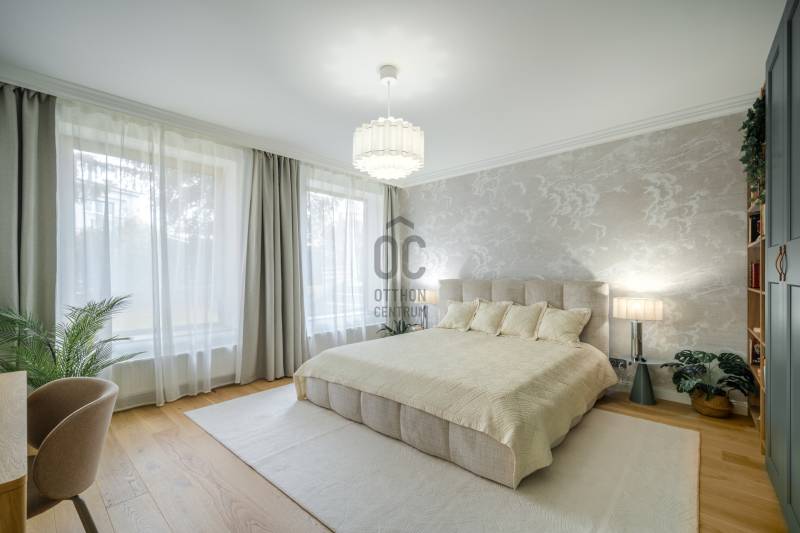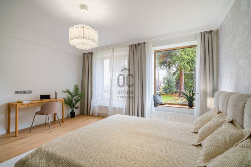 Belbuda szívében, a Stromfeld Aurél út csendes, zöldövezeti szakaszán, a Németvölgyi út közvetlen közelében kínálunk megvételre egy 110 m²-es, három hálószobás, kertkapcsolatos, prémium minőségben felújított otthont.Az 1930-as évek klasszikusan modern Bauhaus építészetének karakteres jegyei a mai kor igényeivel találkoznak: a lakás teljes körű felújítása során az esztétika, a funkcionalitás és az időtállóság egyensúlya volt az irányadó.A padlófűtéssel temperált, napfényes télikerten keresztül érkezünk az otthonba, amely elegáns átmeneti térként fogad, és természetes kapcsolatot teremt a nappali–konyha–étkező térrel. Ez a nagyvonalú, világos egység a családi élet és a vendéglátás ideális színtere.A privát lakrészek kifinomult arányai biztosítják az intimitást: szülői háló, további hálószobák vagy dolgozószoba, igényesen kialakított fürdők, valamint átgondolt tárolórendszer — beépített szekrényekkel, gardróbbal és külön háztartási helyiséggel.Prémium műszaki tartalom:- Padlófűtés a közösségi terekben, radiátoros hőleadás a hálókban,- Külön helyiségben elhelyezett, korszerű gázcirkó rendszer,- Saját klímaberendezés minden szobában,- Háromrétegű, magas minőségű nyílászárók,- Elektromos redőnyök a hő-, fény- és hangkomfort érdekében.A gondozott, zöld kertkapcsolat és a környező fás udvarok a budai nyugalom tökéletes hátterét biztosítják, miközben a városi infrastruktúra — üzletek, éttermek, piac és szolgáltatások — kényelmes sétatávolságban elérhető.Ez az ingatlan nem csupán lakóhely, hanem presztízsértékű, karakteres otthon Belbuda értékálló mikrokörnyezetében — azok számára, akik a minőséget, az építészeti karaktert és a zavartalan nyugalmat egyaránt értékelik.Kifinomult budai életforma, kompromisszumok nélkül. ✨
