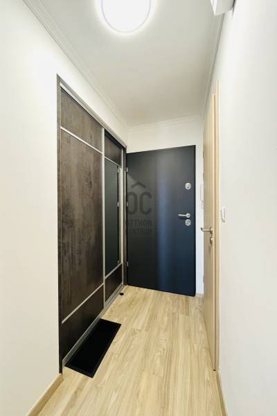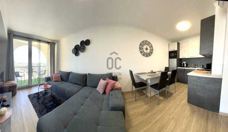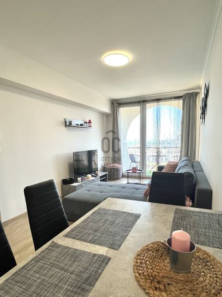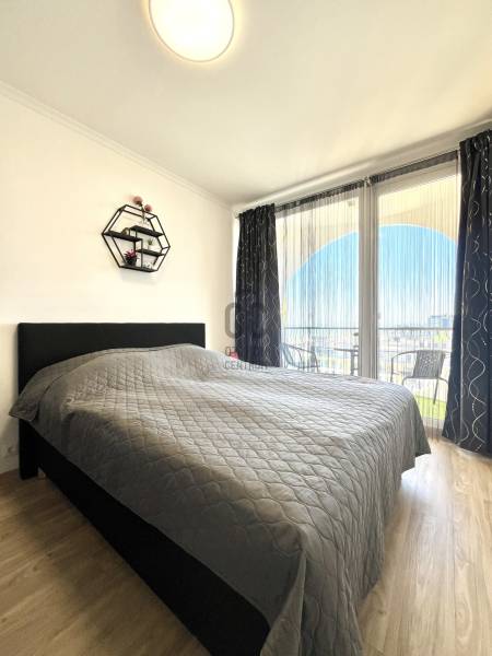 Amerikai konyhás nappali étkezővel, külön nyíló hálószoba, fürdőszoba, külön WC kézmosóval, előszoba, erkély.A lakás világos, modern, letisztult stílusban berendezett, minőségi bútorokkal és teljesen gépesített konyhával.
