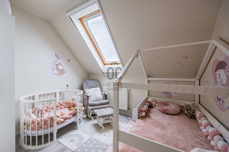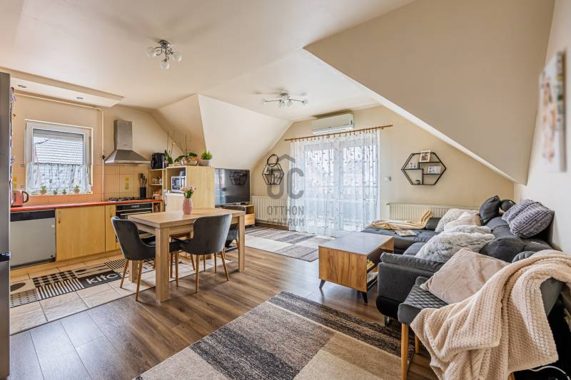 A 2005-ben épült tégla lakás a népszerű ALAGLIGET LAKÓPARKBAN található.Az INFRASTRUKTÚRA kiváló, a környék rendezett, a szomszédság barátságos, családias.A ház ZÁRT közös KERTJÉBEN KÉT JÁTSZÓTÉR is van, ahol a gyerekek biztonságban játszhatnak.A kimondottan JÓ ELOSZTÁSÚ, TÁGAS otthon ragyogó állapotban van.Fekvésének köszönhetően télen is VILÁGOS, nyáron pedig nincs hőség.EXTRÁK: szúnyogháló, redőny, hűtő-fűtő inverteres klíma, riasztó kiállás, beépített előszobai, fürdőszobai és kamra szekrény, aktív szenes beépített vízszűrő,kimondottan alacsony rezsi, két erkély.Az elmúlt 2 évben A LAKÁS FEL LETT ÚJÍTVA:-új laminált padló,-tetőtéri ablak, -napelemes, elektromos redőny,-új fürdőszoba bútor,-egyedi készítésű mosókonyha bútor,-1 éves új beépített sütő (electrolux) és mosogatógép (bosch) a konyhában,-2 db hűtő-fűtő klíma (Samsung és Mitsubishi)A lakás HELYISÉGEI: amerikai konyhás nappali, két különnyíló hálószoba, fürdőszoba, háztartási helyiség, külön wc.Minden szoba NAGY ABLAKOS, fenyőfákra, vagy rendezett lakóparki környezetre néz és KÉT SZOBÁNAK is van SAJÁT TERASZA.A lakás RÉSZBEN TETŐTÉRI, az egyik hálószoba oldalfala és a nappalinak a sarka csapott, így a nettó 63 nm bruttóban 68 nm-t tesz ki.Az összes többi fala egyenes, amitől tágas, JÓL BERENDEZHETŐ.A TETŐTÉR ELŐNYEI:-A csapott résznél \"hiányzó\" légteret NEM KELL BEFŰTENI, ami csökkenti a rezsinket.-A közel 70 nm-es lakás nettóban 63nm (58+fél terasz), így KEVESEBB A KÖZÖS KÖLTSÉG, hiszen azt csak a nettó terület után kell fizetni.-Tetőtéri lakás mindig KUCKÓS, HANGULATOS, ROMANTIKUS, mivel általában a legfölső szinten van, ahová nem jön más.-Fölső szint lévén KÖRBE SÜTI A NAP, ami szintén a téli fűtés számlát csökkenti.Ez a lakás nagyon jól kereszt-huzatolható, szellőztethető, így a nyári hőség sem jelent gondot, a KLÍMÁT szinte nem is kell használni.A lakáshoz EGY ZÁRT ÉS EGY NYITOTT TÉRKÖVEZETT beálló is tartozik.A lakás FENNTARTÁSA KEDVEZŐ, a TELJES REZSI télen 28e, nyáron pedig mindössze 18 ezer forintból kijön!!!A konyhabútor gépekkel a vételár részét képezi.5 perc sétán belül van az új általános iskola, ovi, bölcsi, játszótér, kisbolt, gyógyszertár, háziorvosi rendelő és az ingyenes buszjárat, amely a vasútállomásra visz. 2 perc sétára van pékség, zöldséges, közért, cukrászda, pizzéria, termelői piac.Autóval 5-7 percen belül hipermarketek és minden egyéb elérhető.M2, M0, M3 néhány perc alatt elérhető.Hívjon bizalommal a hét bármely napján!Ez az ingatlan a \"Felező csomag\" megbízási portfólióhoz tartozik. Részletek az Otthon Centrum weboldalán.