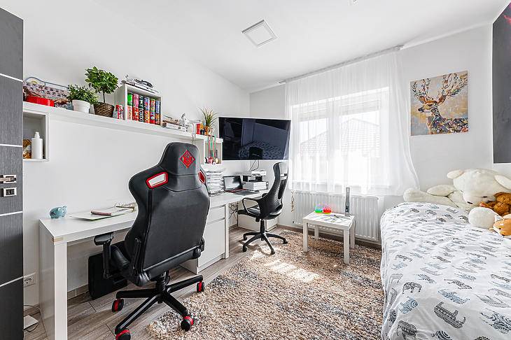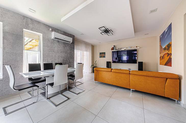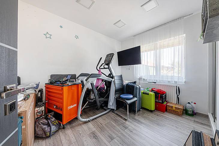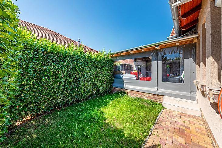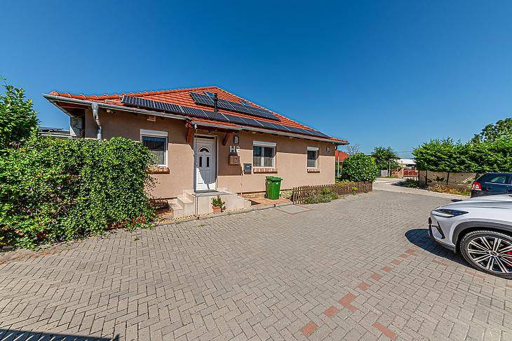 POMÁZON ELADÓ EGY ZÁRT LAKÓPARKI IKERHÁZ-FÉL!A KÖRNYÉK:Pomázon egy zárt lakóparkban, központi helyen, a H5-ös HÉV-től csak 12 perc sétára található. Könnyen megközelíthető rengeteg bevásárlási lehetőség, mint például a Lidl, vagy akár a SPAR szupermarket, melyek szintén 12 perc sétatávra helyezkednek el. A Mátyás Király Általános Iskola 15 perc, míg a Sashegyi Sándor Általános Iskola és Gimnázium 16 perc gyalog.A HÁZ JELLEMZŐI:-A ház hasznos alapterülete: 130 nm.-Plusz egy 22,73 nm-es beépített terasz, ahol klíma került kialakításra.-Plusz egy biciklitároló.-2018-ban épült, 30 cm vastagságú Porotherm téglából.-15 cm-es grafitos szigetelést kapott, melynek köszönhetően a rezsi rendkívül alacsony.-A tető Tondach Bolero terrakotta cseréppel fedett, 20 cm vtg. ISOVER üveggyapot hőszigeteléssel.-A nyílászárók 3 rétegűek, műanyagok.-Az egész házban vízlágyító rendszer került kialakításra.-Elektromos redőnyök és beépített szúnyogháló került kialakításra. -Megtalálható melegvíz tároló is, ami gázról és villanyról egyaránt működik, valamint meleg víz keringgető rendszer is ki lett alakítva.-A fűtésről egy Fondital Itaca 24 kW-os kondenzációs kazán gondoskodik.-A hidegburkolatok alatt padlófűtés, a szobákban radiátorok találhatóak.-Szinte minden helyiségben található klíma, a házban összesen 5 db.-Felszerelésre került 8 db 7 Kw-os napelem hálózat, ami még 8 évig szaldós.-Van energia tároló, ami 10,8 Kw-os, erről megy a kamerarendszer, riasztórendszer és az elektromos autótöltő.-Elektromos redőnyök és beépített szúnyogháló került kialakításra. -A kertben megtalálható egy kerti zuhany.-A telken belül kettő autó számára is van lehetőség a parkolásra.FINANSZÍROZÁS:Banki finanszírozással is megvásárolható, melyben irodánk ingyenes tanácsadással áll rendelkezésükre!VEVŐINK RÉSZÉRE A KÖZVETÍTÉS DÍJTALAN! A hirdetésben szereplő adatok tájékoztató jellegűek!