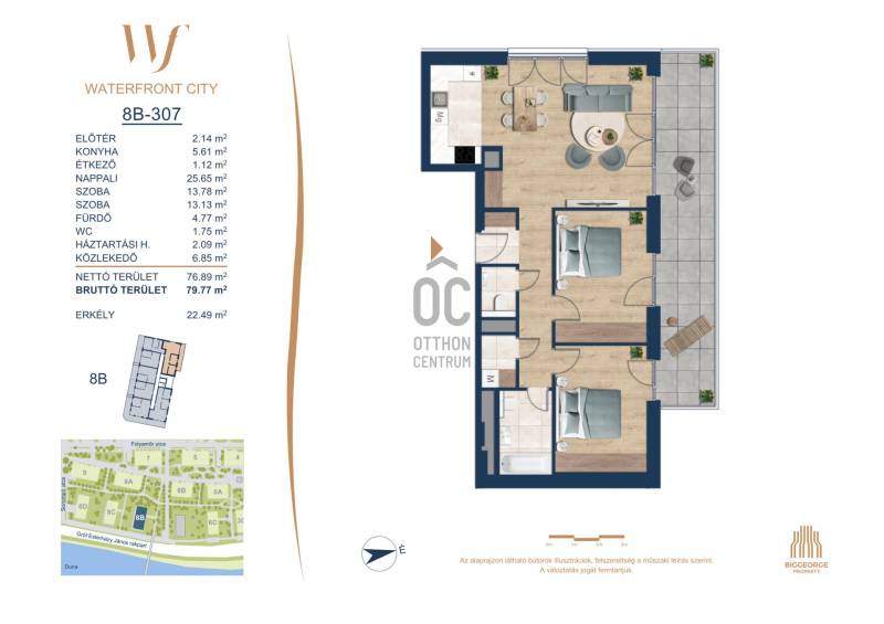 Projekt bemutatásaA projektrőlA Waterfront City egy új, modern városnegyed a 3. kerületben, ahol a természet közelsége és a városi kényelem tökéletes egyensúlyban van. A Duna-part közvetlen szomszédságában elhelyezkedő fejlesztés különleges atmoszférát kínál: a sétányt új épületek határolják, üzletekkel, kávézókkal és szolgáltatásokkal, amelyek élhető közösségi teret teremtenek.A 13 emeletes lakóépületből lenyűgöző örökpanoráma nyílik a budai hegyekre és a folyóra, a tágas teraszok pedig ideálisak a pihenéshez vagy a baráti összejövetelekhez. A zöldtetők, parkosított terek és fenntartható megoldások – mint az energiatakarékos rendszerek és okos otthon funkciók – mind hozzájárulnak a modern, környezettudatos életstílushoz.Látogass el értékesítési irodánkba, és tekintsd meg a városnegyed makettjét személyesen! Ismerd meg, milyen lesz az élet Budapest egyik legizgalmasabb új fejlesztésében!Óbuda szívébenKépzeld el, ahogy egy napsütéses délelőttön Óbuda szívében sétálsz, a Duna közelsége frissítően hat rád, miközben a Folyamőr utca, a Miklós tér és a Bogdáni út által határolt, öt hektáros területre érsz. A levegőben ott van a város történelme, mégis minden részletében a jövő hívogat.A 50 000 négyzetméteres területen egy hangulatos sétány vezet végig, amely egyenesen az óbudai Fő térre visz – mindössze 600 méterre. Ez a sétány nem csupán összeköt, hanem élményt nyújt: a Kolosy térről induló Óbudai Promenád részeként a város egyik legélhetőbb, legpezsgőbb szakaszán haladsz végig. És ha biciklivel érkeznél? A nemzetközi kerékpárút is itt halad el, Szentendre felé vezetve.Az 5. ütemben épülő 149 lakás mindegyike egyedi hangulatot kínál. Ahogy belépsz egy-egy otthonba, a hatalmas üvegfelületeken át beáradó fény és a tágas, szellős terek azonnal magukkal ragadnak. A kilátás? A Kaszap István park zöldje nyújt békét, míg a felsőbb emeletekről a Budai-hegység örökpanorámája tárul eléd – minden nap egy új festmény az ablakodban.A 6. ütemben 316 modern lakás épül, tágas teraszokkal és lenyűgöző kilátással a Dunára és a budai hegyekre. A lakók kényelmét őrszolgálat, kamerarendszer, mélygarázs, vendéglátóhelyek, belső park, játszótér és E-autó töltők szolgálják. Ez a projekt utolsó üteme, amely még közvetlen Duna-parti kapcsolattal rendelkezik.