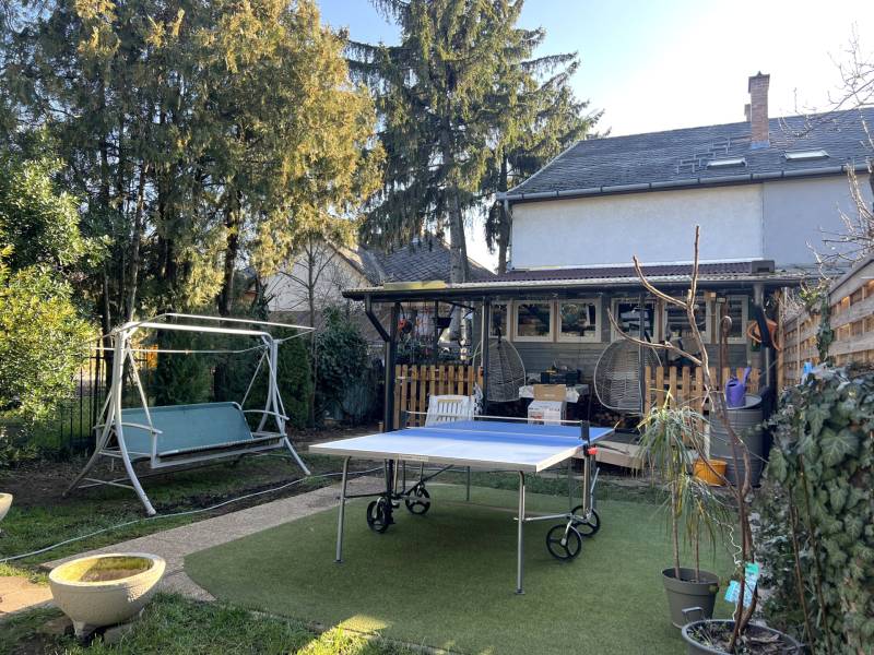 Budapest egyik legkedveltebb kertvárosi részén, Szent Imre-kertváros nyugodt, forgalomtól távoli utcájában kínálunk megvételre egy téglaépítésű, 5 szobás ikerházat, amely 470 m²-es saját telekrésszel rendelkezik.Az 1968-ban épült ingatlan az évek során több felújításon és bővítésen is átesett, így kényelmes és jól használható életteret biztosít. A bruttó 180 m²-es ház négy szinten helyezkedik el, praktikus elrendezéssel.ELRENDEZÉSFöldszint✅tágas nappali hangulatos kandallóval, erkélykapcsolattal✅előtér✅zuhanyzós fürdőszoba✅külön WC✅konyha étkezőrésszel✅beépített terasz✅nagy fedett teraszEmelet✅3 hálószoba✅közlekedő✅kádas fürdőszobaBeépített padlástér✅1 nagy szoba✅beépített tárolórészPinceszint✅kb. 30 m²-es garázs✅pincerész gépészettelMŰSZAKI JELLEMZŐKA fűtést egy új, korszerű Saunier Duval álló kondenzációs gázkazán biztosítja, amelyhez 100 literes melegvíz-tároló tartozik. A nappaliban található kandalló további komfortot és hangulatot teremt.Az ingatlan minden szinten betonfödémes, ami stabil szerkezetet biztosít.KÜLSŐ TEREK ÉS KERTA korábbi hátsó terasz beépítésre került, előtte pedig egy új, nagy méretű fedett terasz lett kialakítva, amely ideális családi és baráti összejövetelekhez.A kertben jelenleg egy új, nagyméretű faház (kerti tároló) épül betonalapra, amely elektromos kiállással kerül átadásra az új tulajdonosnak.PARKOLÁS➡️1 autó számára garázs➡️az ingatlan előtt és a telken belül további 3 autó parkolása megoldottA ház utcai frontján két szinten nagy erkély található felújított korláttal, valamint egy emeleti külső lépcső is kialakításra került.TOVÁBBI LEHETŐSÉGEKAz ingatlan könnyen kétgenerációssá alakítható, így nagycsaládosok vagy összeköltözők számára is kiváló választás.KÖRNYÉKSzent Imre-kertváros ezen része nagy telkekkel, szellősen elhelyezett családi-, iker és villaházakkal és széles, gondozott utcákkal rendelkezik, amely nyugodt, zöld környezetet és magas életminőséget kínál lakóinak.