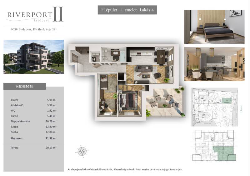 Budapest egyik legkülönlegesebb vízparti övezetében, a III. kerületi Római-parton, a Riverport II. új építésű, kis lakásszámú társasházában kínálunk megvételre egy 1. emeleti, 71 m²-es, nappali + 2 hálószobás lakást, amelyhez 20 m²-es dunai panorámás terasz tartozik. Ez az ingatlan ideális választás azok számára, akik modern műszaki tartalommal rendelkező, energiatudatos otthont keresnek közvetlen vízparti környezetben.LAKÁS ÖSSZEFOGLALÓ- 71 m² alapterület- Nappali + 2 hálószoba- 20 m²-es dunai panorámás terasz- Új építésű, korszerű műszaki megoldások- Kis lakásszámú, exkluzív társasház- A teraszról nyíló panoráma és a nagy üvegfelületek különleges, világos életteret teremtenek, ahol a Duna látványa a mindennapok részévé válik.- Teremgarázs hely és tároló vásárlása kötelező, a vételáron felül +16,8 MFt.- Tervezett átadás: 2026. augusztus–szeptemberMŰSZAKI TARTALOM – időtálló minőség, energiatudatos megoldásokMonolit vasbeton szerkezet, vízzáró lemezalap30 cm Ytong falazat, 16 cm kőzetgyapot homlokzati szigetelésHáromrétegű, hőhídmentes alumínium nyílászárókMennyezeti hűtés-fűtés + padlófűtés, hőszivattyús, gázmentes rendszerLépésálló és akusztikai szigetelés a magas komfort érdekébenElektromos autótöltő-előkészítés minden garázshelyhez24 órás kamerarendszer, NFC-alapú beléptetés, riasztó előkészítésOptikai internet és CAT6 hálózatZárt, parkosított kert: játszótér, sportfelület, gyerekmedenceA projekt műszaki tartalma hosszú távon alacsony fenntartási költséget és kiemelkedő lakókomfortot biztosít.ELHELYEZKEDÉS – Római-part, III. kerületA Római-part Budapest egyik legismertebb és legkedveltebb vízparti területe, a Megyeri híd és az Árpád híd között.A környék egyedülálló hangulatát a Duna-parti sétány, éttermek, kávézók és hangulatos teraszok adják, miközben a természet közelsége valódi nyugalmat biztosít.Sport- és szabadidős lehetőségek:kerékpárút és futóútvízisportok, kajakozásstrandolási lehetőség a közeli Római Strandfürdő területénA Királyok útja végén elhelyezkedő projekt kiváló közlekedési kapcsolatokkal rendelkezik, az M0 autóút néhány perc alatt elérhető.A Riverport II. a nyugalom, a természet és a prémium vízparti élet harmonikus találkozása – modern otthon azok számára, akik értékelik a minőséget és a kivételes lokációt.Amennyiben további információra van szüksége, vagy szeretné megtekinteni a projektet, kérem, keressen bizalommal. Örömmel állok rendelkezésére.