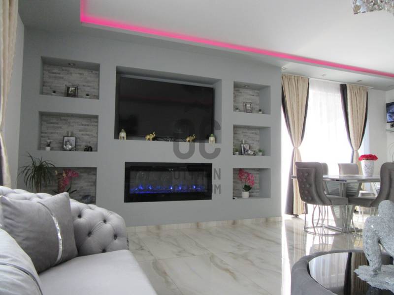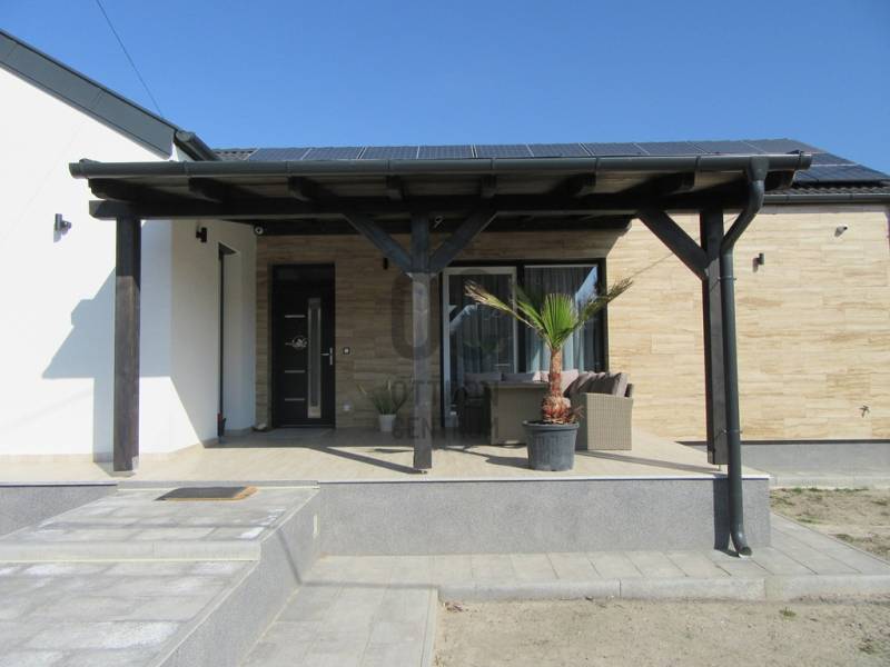 Eladó egy 2025-ben épült, exkluzív kivitelezésű ikerház egyik lakóegysége, ahol a két házrészt egy külön tároló választja el egymástól, biztosítva a zavartalan nyugalmat és a nagyobb privát szférát.Az ingatlan modern építészeti megoldásokkal és kiemelkedő műszaki tartalommal készült. A falazat 30 cm-es Porotherm téglából épült, amelyet 15 cm-es homlokzati hőszigetelés egészít ki. Az energiahatékonyságot 10 cm lépésálló aljzatszigetelés és 20 cm födémszigetelés biztosítja. A házban háromrétegű üvegezésű nyílászárók találhatók, elektromos redőnnyel és szúnyoghálóval felszerelve.A fűtésről 8 kW-os Daikin hőszivattyúval működő korszerű padlófűtés gondoskodik, míg a kellemes hőmérsékletet a nyári hónapokban két inverteres klímaberendezés biztosítja. Az energiahatékony működést 8 kW-os napelemes rendszer és H tarifa támogatja.A belső tér kialakítása stílusos és magas minőséget képvisel: igényes burkolatok, luxus kategóriájú fürdőszoba, valamint teljesen gépesített, modern beépített konyha került kialakításra. A nappali különleges hangulatát egy beépített elektromos kandalló teszi még elegánsabbá és otthonosabbá.A biztonságot kamerarendszer és riasztó szolgálja, míg a mindennapi kényelmet elektromos kapu növeli.A nappaliból egy 26 m²-es, déli tájolású terasz nyílik, amely tökéletes helyszínt biztosít pihenéshez, családi étkezésekhez vagy baráti összejövetelekhez. Az udvarban fedett, térkövezett, kétállásos kocsibeálló található.Az ingatlan tehermentes és azonnal birtokba vehető, így új tulajdonosa akár rövid időn belül élvezheti ezt a modern, energiatakarékos otthont.Ez a ház ideális választás mindazok számára, akik minőségi kivitelezést, korszerű technológiát és elegáns, nyugodt otthoni környezetet keresnek.Az ingatlan rugalmasan nézhető, hívjon, egyeztessünk időpontot.