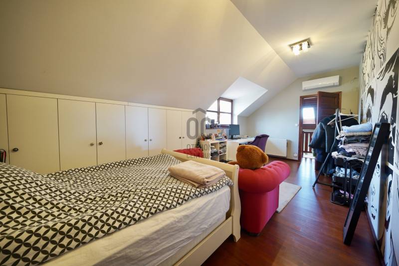 Mogyoród kedvelt, nyugodt részén, a Szentjakab Lakóparkban kínálunk megvételre egy kivételes adottságokkal rendelkező, önálló családi házat, amely ideális választás mindazok számára, akik a minőséget, a kényelmet, a csendes és természetközeli otthonukat keresik.A 910 m²-es saroktelken elhelyezkedő, háromszintes ingatlan nettó 318 m² lakóterülettel rendelkezik. A tágas, világos terekhez 270 cm-es belmagasság társul, amely tovább erősíti az otthon exkluzív érzetét.A ház földszintje teljes körűen megújult, itt kapott helyet egy modern, prémium minőségű, teljesen felszerelt konyha, bőséges tárolókapacitással és beépített hűtőszekrénnyel. Az alsó szinten padlófűtés biztosítja a komfortot, amely gázcirkóval és hőszivattyús rendszerrel, kombinált megoldásként működik. Több helyiségben egyedileg tervezett, minőségi beépített bútorok találhatók.A teljes felső szint klímatizált.Az ingatlan számos előkészítéssel rendelkezik:– kandalló előkészítés– riasztórendszer előkészítésA ház energiahatékonyságát 10 kW-os, még 8 évig szaldós elszámolású napelemrendszer biztosítja (3×32 A), amely jelentősen csökkenti a fenntartási költségeket.( vilanyszámla nulla forint !) A gondozott kert valódi pihenőoázis:– 85 m²-es teraz-külön nyári grill terasz,konyhával– 8 × 3,5 × 1,5 méteres, fűthető medence, amely saját gázkazánról kapja a fűtést ha erre szükség van.– igényesen kialakított zöldfelületek-automata öntözőrendszerAz épület belső és külső megjelenését egyaránt gyönyörű, prémium kőburkolatok teszik időtállóvá és elegánssá.Az ingatlanhoz önálló pince, tároló és az ár részét képező garázs is tartozik. A közlekedés kiváló: az M3-as autópálya néhány perc alatt elérhető, a tömegközlekedési Hév megálló pedig mindössze kb. 3 perc sétára található.A Szent Jakab park falu egy 0-24-es porta szolgálattal védett, csendes zöld környezetben található kis oázis. Havi 25.000 ft közös költséget kell fizetni melybe bele tartozik az állandó biztonsági szolgálat, takarítás, közterületi ház előtti kert karbantartása. Ez az ingatlan ideális választás nagyobb családok számára, illetve azoknak, akik kompromisszumok nélkül szeretnének modern, jól felszerelt, értékálló otthont egy csendes, mégis kiváló infrastruktúrával rendelkező környezetben.Amennyiben felkeltette érdeklődését, kérem, forduljon hozzám bizalommal a megtekintés egyeztetése érdekében.Ez az ingatlan a \"Felező csomag\" megbízási portfólióhoz tartozik. Részletek az Otthon Centrum weboldalán.