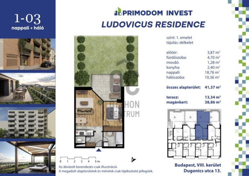 Fedezze fel ezt a kivételes lehetőséget a fiatal felnőttek számára, akik modern, kényelmes és világos lakást keresnek Budapest szívében! Az Orczy negyedben található új, 41.37 nm-es lakásunk ideális választás, ha Ön egy friss, energikus környezetben szeretne élni, ahol a város nyüzsgése és a természet közelsége egyaránt megtalálható. Újépítésű lakásról lévén szó vételi szándék esetén előszerződés köttetik az építtetővel. A tervezett átadás 2026 nyara.Műszaki tartalom:Az épület monolit vasbeton lemezalapra épül. Az épület hagyományos építési módban kerül kivitelezésre, monolit vasbeton vázszerkezettel, statikailag méretezett monolit vasbeton födémekkel, merevítő falakkal és pillérekkel.A külső térelhatároló fallak pórusbeton vázkitöltő falazatok. Mind a téglafalazatok, mind a vasbeton falak az előírt hőtechnikai méretezésnek megfelelő vastagságú hőszigetelő rendszerrel készülnek. A lakásokon belüli válaszfalak 2x2 rétegű gipszkarton szerkezetből készülnek.A födémeken a lépés-hanggátlás biztosítására akusztikailag minősített szigetelésen úsztatott aljzatbeton készül, mely egyben a burkolatok fogadó szerkezete is.Az épület lapostetős kialakítású zöldtetővel.Az épületben fehér színű műanyag profilrendszerű szerkezetek kerülnek elhelyezésre korszerű, többrétegű hőszigetelő üvegezéssel, jó légzárással. A műanyag homlokzati nyílászárók vagy komplett redőnnyel kerülnek beépítésre, vagy redőny nélkül.Az épület homlokzata ragasztott klinker burkolat vagy vakolt felület. Az épületben 1 db 13 személyes 1000 kg korszerű hívólift kerül beépítésre. Az épületben egy modern megjelenésű, lamellázással részben védett, nyitott homlokzatú lépcsőház kerül kialakításra. A teremgarázs bejáratánál távirányítással működtethető garázskapu kerül elhelyezésre. Az épület földszintjén egyszintes teremgarázs kerül kialakításra. A gépkocsibeállókhoz elektromos töltő kiépítésének lehetősége biztosított.Az épület teljesíti a 7/2006. TNM rendelet közel nulla energiaigényű épületekre vonatkozó követelményeit. A fűtési energia és melegvíz előállítására szolgáló energia korszerű hőszivattyúkkal központilag kerül előállításra. A lakások fűtése a folyamatos tartózkodásra szolgáló helyiségekben padlófűtéssel valósul meg. A hőszivattyús rendszer lehetővé teszi a lakások hűtését is oldalfali fan-coil berendezések segítségével.A kaputelefon rendszer digitális, ajtónyitó funkcióval ellátott.A lakás belső kialakítását, úgymint burkolatok, kádak, zuhanyok, szaniterek, csaptelepek, belső ajtók vásárlóink különböző, belsőépítészek által összehangolt anyagválasztékú és színvilágú berendezési csoportokból választhatja ki a vevő, amely a megtekintés során kerül ismertetésre. A képek között szerepel az értékesítési iroda bemutatóterem része is, ahol az érdeklődők szemrevételezni tudják a választékot.A lakás konyhabútor, valamint konyhagépek nélkül kerül átadásra.A hideg- és használati melegvíz, valamint a fűtés-hűtés energia fogyasztása lakásonként önállóan mérhető. A lakás 1x32A elektromos kapacitással rendelkezik. A lakás az első emeleten található és közvetlen kertkapcsolattal rendelkezik, amelyre a 13,34 négyzetméteres teraszon keresztül jutunk ki. A kert 38,86 négyzetméter. A lakás tájolása délkeleti, így kiváló fényviszonyokkal rendelkezik. Ez a lakás kiváló választás egyetemistáknak, fiatal házaspárnak, vagy akár egyedülállóak számára is.Az épület a Ludovika Huszárlovarda szomszédságában található. A Dugonics utca a VIII. kerület egyik csendesebb mellékutcája az Orczy-negyedben, amely az elmúlt években folyamatos rehabilitáción megy keresztül. A környéken egyre több fejlesztés indul, amely tovább növeli a városrész vonzerejét a lakók és a befektetők számára. A közelben található az Orczy-kert, az ELTE Füvészkert, valamint több egyetem és jó tömegközlekedési kapcsolat, ami különösen vonzóvá teszi a területet bérbeadási és befektetési szempontból.