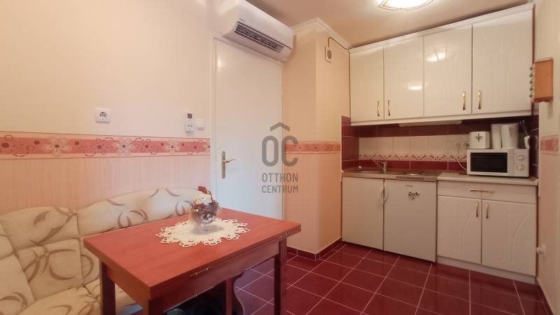 Balatoni nyaraló 50 m-re a strand bejáratától!Eladásra kínálunk Balatonlellén egy 39 nm-es, 2 szobás, erkéllyel rendelkező I. emeleti társasüdülői lakást.A nyaraló 2012-ben teljeskörű felújításon esett át, mely magában foglalta az alábbiakat:-víz-és villamoshálózat cseréjét,-hőszigetelt alumínium redőnyök, szúnyoghálók felszerelését,-mennyezeti infrapanel fűtés kialakítását,-hűtő-fűtő klímaberendezés beszerelését,-burkolatok, szaniterek cseréjét, valamint-a konyhába elektromos főzőlap beszerelését.-!Májusig teljes homlokzatfelújítást végeznek a társasházon, melynek ráeső költségét a tulajdonos már kifizette!-Az ingatlant kizárólag a tulajdonosok használták, ezáltal szép, megkímélt állapotban van. Gondnok áll rendelkezésre, így az üdülő lépcsőházának és környezetének karbantartása megoldott.Lehetőség van a társasüdülő saját parkolójában való parkolásra, mely zárható.Elhelyezkedését tekintve kiváló, a szabadstrand, illetve a vitorláskikötő az épület bejáratától 50 m-re, a Sétáló utca gyalogosan 5 percnyire található.A vasút NEM az üdülő közvetlen közelében helyezkedik el, így nem zavarja a lakók nyugalmát!-A társasház téliesített, szezonon kívül is használható!-A teljes berendezés a vételár részét képezi!Hitelre van szüksége? Az Otthon Centrum az ország egyik legnagyobb és legmegbízhatóbb hitelközvetítőjeként, teljes körű és díjmentes hitel ügyintézéssel, biztosításkötéssel áll rendelkezésére! Kérje személyre szabott ajánlatunkat Kollégáinktól!Válassza ki az Önnek legmegfelelőbbet!
