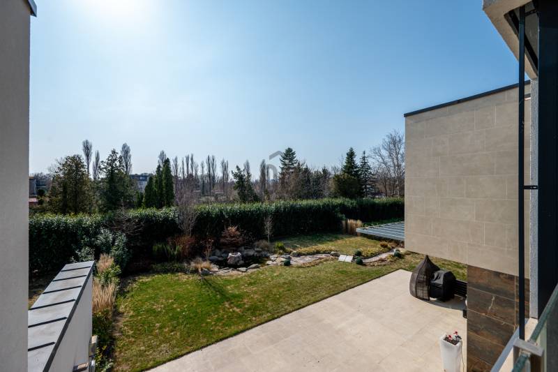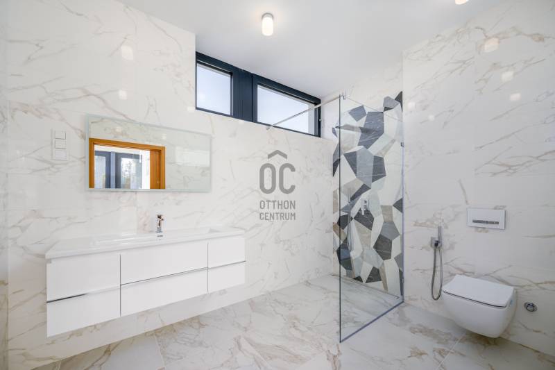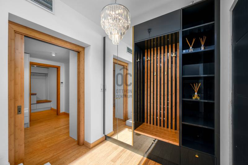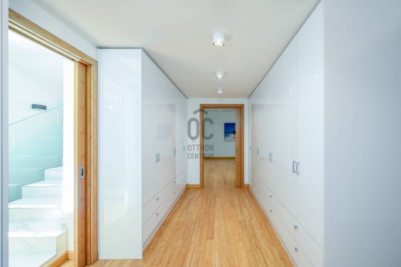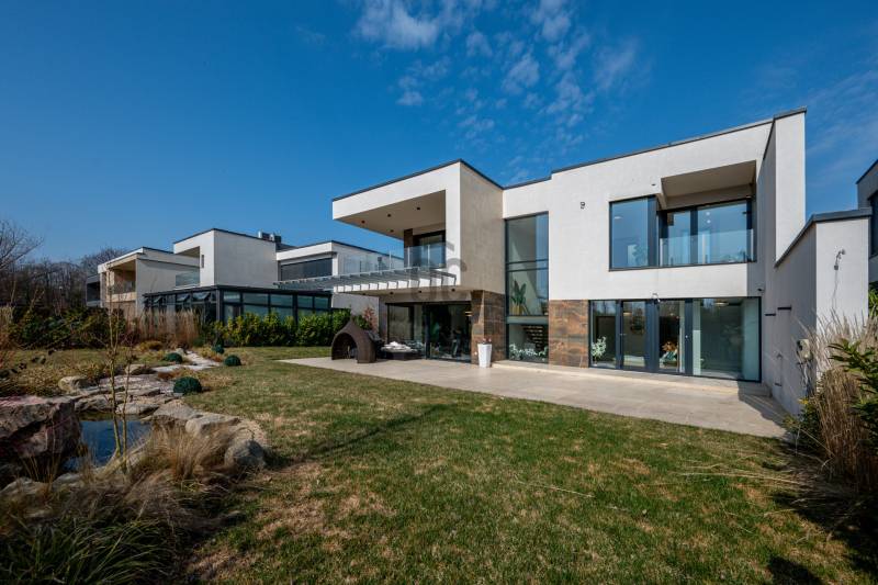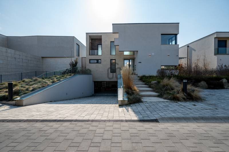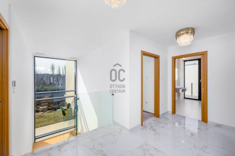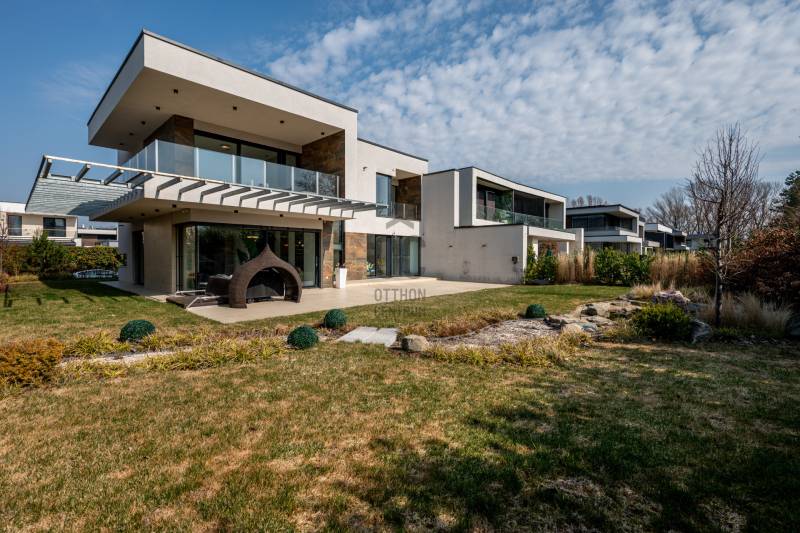 Budapest III. kerületének egyik legexkluzívabb, Duna-part közeli lakóparkjában, a The Village lakóparkban kínálunk megvételre egy különleges, minden részletében prémium minőségben kialakított luxusvillát.A közel 27.664 m² parkosított zöldterületen elhelyezkedő, zárt és őrzött lakópark a természet közelségét és a modern városi élet kényelmét ötvözi. A Duna-part néhány lépésre található, a gondosan megtervezett kert, a japán zen hangulatú park és az elegáns lakókörnyezet nyugodt, privát életteret biztosít a lakók számára.A kb. 800 m²-es telken álló, háromszintes villa közel 300 m² lakóterülettel, 60 m² terasszal és 42 m² erkéllyel rendelkezik. A ház terei nagyvonalúan megtervezettek, világosak és elegánsak, a belső kialakítás során pedig minden részletnél a minőség és az időtálló design volt a meghatározó.A földszinten egy tágas, egy légterű nappali–étkező–konyha kapott helyet, amely közvetlen kapcsolatban áll a terasszal és a kerttel. A prémium kategóriás konyha felsőkategóriás AEG beépített gépekkel, borhűtővel, corian munkalappal és egyedi tervezésű konyhabútorral készült. A nappali eleganciáját egy modern biokandalló emeli ki.Az emeleten három kényelmes méretű hálószoba, gardrób és két fürdőszoba található, amelyekhez erkélyek kapcsolódnak. A földszinten külön szülői lakrész biztosítja az intim, nyugodt privát teret saját gardróbbal és fürdőszobával.A garázsszinten kétállásos, fűtött garázs kapott helyet elektromos autó töltési lehetőséggel, valamint tároló, mosókonyha, gépészeti helyiség és egy hobby szoba is kialakításra került.A villa műszaki felszereltsége a legkorszerűbb technológiát képviseli. A LOXONE okosotthon rendszernek köszönhetően a ház számos funkciója – például a fűtés-hűtés, világítás vagy egyéb rendszerek – akár telefonról is vezérelhető, így a mindennapi kényelem és energiahatékonyság maximálisan biztosított.A komfortot többek között az alábbi rendszerek szolgálják:- Mitsubishi Zubadan hőszivattyú- mennyezeti hűtés-fűtés és padlófűtés- fan-coil rendszer- teljes szellőztető rendszer- Schüco alumínium, háromrétegű üvegezésű nyílászárók- riasztó- és kamerarendszerA kertben egyedi tervezésű japán zen kert található kerti tóval, automata feltöltő és öntözőrendszerrel, valamint hangulatos kertvilágítással, amely különleges atmoszférát teremt.A lakópark lakói számára közösségi épület és nagyméretű medence is rendelkezésre áll, valamint wellness részleg kialakítása is folyamatban van. A terület biztonságáról 24 órás portaszolgálat és sorompós beléptetés gondoskodik.Ez az ingatlan ideális választás mindazok számára, akik a Duna közelségében, elegáns és biztonságos környezetben keresnek különleges otthont, ahol a természet nyugalma és a városi élet kényelme egyszerre van jelen.További információért és megtekintéssel kapcsolatban keressen bizalommal.