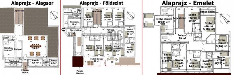 Mátraderecskén eladó a falu ikonikus fogadó-panziója, 18 szobás/fürdőszobás 1-2-3 ágyas szobákkal, plusz 36-42 fő étkeztetésére alkalmas étteremmel.Az ingatlanról készült bemutatóvideót megtekintheti az oc.hu weboldalon.A fogadó-panzió kizárólag az Otthon Centrum kínálatában érhető el!A hirdetési ár, nettó ár!Gyalog 1,5 km-re/20 percre van a Mofettától, a vendégek nagy része a széndioxidos kezelés miatt szál meg faluban, de egyéb kikapcsolódási lehetőségek is vannak a környéken.A fogadó-panzió egész évben üzemel, a Mofetta látogatói évszakoktól függetlenül, folyamatosan érkeznek.boltok, falu központ 5 percen belül elérhetők.A telek mérete 534 nm, gondozott terület. Az épület a \'70-es években épült, 2018-ban megújult arculattal fogadja a vendégeket.A panzió hasznos lakóterülete meghaladja a 500 nm-t, 3 szint: - alagsor: konyha, előkészítő helyiségek, étterem.- földszint: recepció, 9db apartmanszoba fürdőszobával.- emelet: 9db apartmanszoba fürdőszobával.A szomszédos épületet is megvásárolva esetleg bővíthető, további 300-400 nm-rel, garázsokkal, szobákkal....Összesen 18 lakószobával rendelkezik, teljes foglaltság esetén akár 36 fő (+pótágyak) befogadására alkalmas.A fogadóval szemben egy hatalmas, árnyékos parkoló várja a szállóvendégeket.Az épülethez tartozik egy kb. 30 nm-es pince is...Az épületek külső nyílászárói műanyagból és hang- és hőszigetelt fából vannak, a belső nyílászárók fából készültek.A lakószobák laminált padlóval, a többi helyiség pedig járólappal van burkolva.Az épület fűtéséről gázkazán gondoskodik, a meleg vizet két gázbojler szolgáltatja.A fogadó-panzió teljes berendezéssel együtt eladó. Céggel együtt is megvásárolható, az irányár nem tartalmazza az áfát.A képek és a videó a figyelem felkeltésére szolgál, de komoly érdeklődőknek az összes nagy felbontású fényképet is rendelkezésére bocsátom (kb.110db).Az épületek méretarányos elrendezését a képek között megtalálható 3D-s alaprajz mutatja.A 3D alaprajzok cm-re pontosan, az eredeti méretek alapján készültek, ezeket a komoly érdeklődők rendelkezésére bocsátom a megtekintés után, hasznos lehet a tervezés és a berendezés során ;-) .Ha a hirdetés felkeltette az érdeklődését és kérdése van, kérem hívjon a megadott telefonszámomon.Ingatlanirodánk teljeskörűen segíti az ingatlanok adásvételét, ügyvéd, bankfüggetlen hitelügyintéző, energetikus és a lelkes ingatlanközvetítő is rendelkezésére áll akár hétvégén, vagy ünnepnapokon is ;-)
