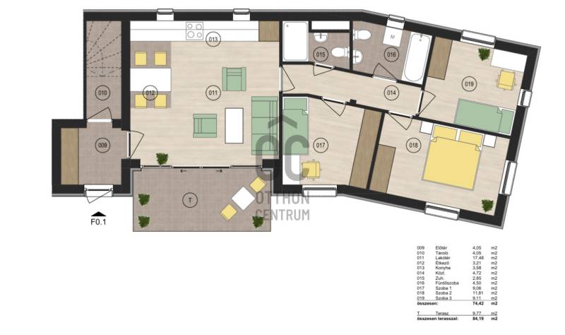 A megjelölt vételár, szerződéskötéskor 100 % befizetésével érvényes !Egyéb fizetési ütemezés esetén az ár változik, erről kérjen bővebb felvilágosítást !!Az ingatlan a földszinten helyezkedik el, terasz kapcsolatos.Projekt bemutatásaDebrecen kedvelt, és egyik legértékálóbb részén, a Hatvan Utcai kert csendes utcájában, közel a Kenézy kórházhoz épül, egy 5 lakásos társasház.Az ingatlan a legmodernebb építőanyagokkal, szerkezeti elemekkel lesz megépítve.Minden lakás terve átgondolt, élhető tereket tartalmaz, jó kiosztású, modern elrendezésű.Várható átadás : ha minden jól megy 2026 év vége, de max 2027 tavasza.A társasház felépítése : Földszinten : 1 db lakás ( 74,42 m2 ) + teraszkapcsolattal ( 9,77 m2 ) , 5 db gépkocsitároló és 5 db tárolóEmelet : 2 db lakás erkéllyel ( egyik lakás :74,42 m2 + 9,77 m2 erkély , a másik lakás : 62,87 m2 + 4,1 m2 erkély )Tetőtér : 2 db lakás ( egyik lakás : 57,2 m2 , a másik lakás: 52,18 m2 )Műszaki jellemzői :- Leier 30 NF tégla főfalak- Leier 10 Nf tégla válaszfalak- homlokzati, lábazati szigetelés : 15 cm polisztirol- nyeregtetős tetőszerkezet, betoncserép héjazással- nyílászárók : műanyag , 3 rtg - ű üvegezés a 6 légkamrás profilban ( prémimum német minőség, szinezett kivitelben )- fűtés : levegő - víz hőszivattyú alkalmazással lesz megvalósítva, padló hőleadókkal , vizes helyiségekben törölköző szárítóval - árnyékolás : elektromos vezérlésű aluminium redőny- erkély : edzett üveg betétekkel- kaputelefonos és kódzárós beléptető rendszer- udvar : térkövezés, füvesítés, parkosítás, kandellábelek az udvaron kivitelezésre kerülnekMűszaki tartalom:- beltéri ajtók : borovi dekorfóliás, 5 féle választható szinben- hidegburkolat : 8.200 Ft/m2 bruttó ár- melegburkolat : 8.500 FT/m2 bruttó ár- zuhanykabin : 89.280 Ft/db nettó ár- mosdó : 25.500 Ft/db nettó ár- fürdőkád : 101.500 Ft/db nettó ár- beépített wc : 58.600 Ft/db nettó ár- zuhany csaptelep : 26.280 Ft/db nettó ár- mosdó csaptelep : 25.700 Ft/db nettó ár- kádtöltő csaptelep : 29.500 Ft/db nettó árAz ingatlan előnyei : nagyon jó lokáció, kis lakóközösség, modern kivitelezés, a korszerű technológiák alkalmazása miatt kiváló energetikai besorolás, alacsony fenntartási költség, stb...Ha felkeltettem az érdeklődését, kérem hívjon bizalommal, akár hétvégén is, adok tájékoztatást, és amennyiben érdeks lehet a helyszínen bemutatom az ingatlant.Köszönöm, hogy elolvasta !!!