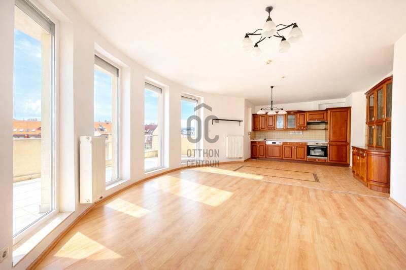 46m2-es TETŐTERASZ a 13, kerület - KEREKES UTCÁBAN (Béke-tér).KIadó egy 77 m2-es (+46m2 tetőterasz) jó állapotú részben bútorozott lakás a következő paraméterekkel:- 46m2-es tetőterasz;- 32m2-es nappali-konyha;- 2 hálószoba;- Házközponti fűtés;- 5m-es tároló;- 16m2-es teremgarázs;- Társasház 2006-ban épült;- Macska hozható, kutya sajnos nem hozható.A lakás a folyósó végén található, amely lehetőséget biztosított a lakás tulajdonosának a folyósó részből 5m2 leválasztására, ahol tároló szerkrények kerültek kialakításra. Ezen leválaszott részt rácsos ajtó véd az illetéktelen belépéstől.Ha a fényképek és a lakás paraméterei elnyerték tetszését, kérem keressen bizalommal!