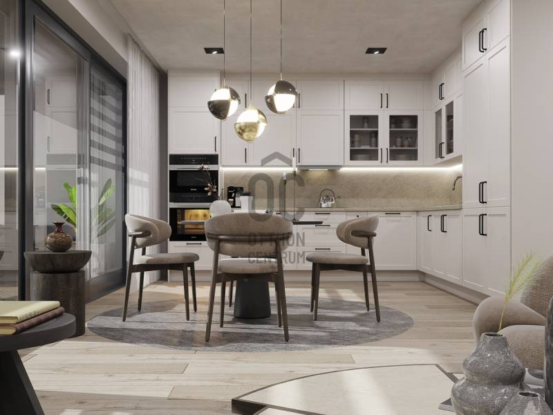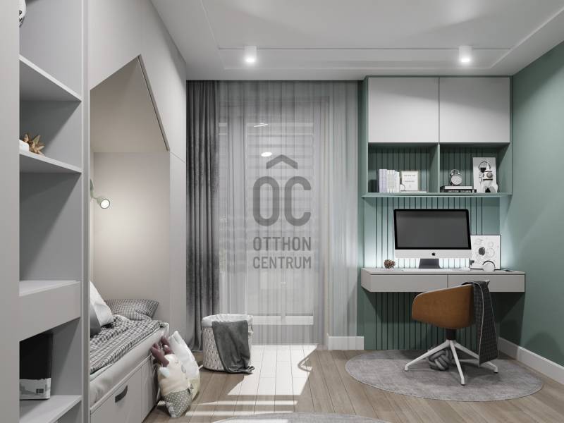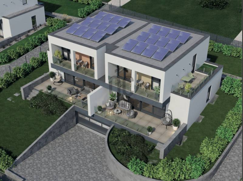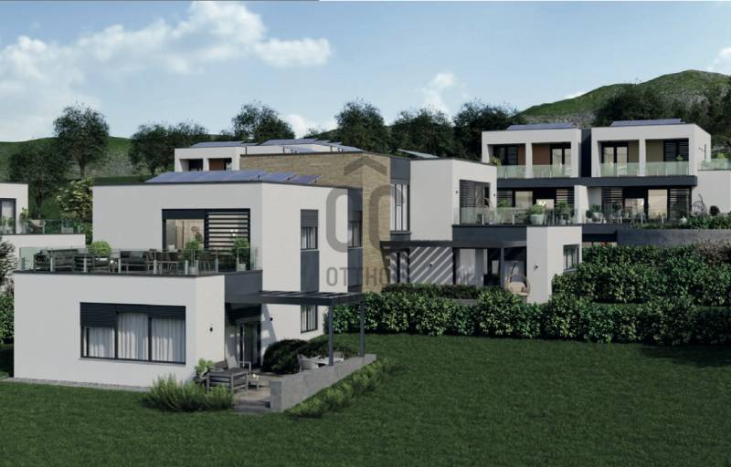 Aranyhegy egyik legszebb részén, a csendes Almáskert utcában kínálunk eladásra egy vadonatúj, panorámás, luxus színvonalú ikerházat.Az ingatlan 121,85 m²-es, két szinten elosztva, összesen 5 szobával és három terasszal rendelkezik. A tágas és világos tereket a délnyugati tájolás és a Hármashatár-hegyre nyíló kilátás teszi igazán különlegessé.Főbb jellemzők:Alapterület: 100 m² ( bruttó 121,85 m² ) (Földszint: 71,45 m² + Emelet: 50,40 m²)Helyiségek száma: 5 szoba, 2 fürdőszoba, amerikai konyhás nappali, előszobaTeraszok: 3 db (összesen több mint 40 m²)Kert: 300 m2Kilátás: Panorámás, zöldövezetiKomfort fokozat: LuxusFűtés: Modern levegő-víz hőszivattyús rendszer padlófűtéssel és fan-coil hűtésselFontosabb műszaki adatok:Szerkezet: Porotherm X-therm falazat, monolit vasbeton födémek, 15 cm hőszigetelésTető: Lapos tető, modern víz- és hőszigeteléssel (Bauder rendszer)Nyílászárók: Háromrétegű, hőszigetelt műanyag ablakok (Ug=0,5 W/m²K), motoros alumínium redőnyökBurkolatok: Prémium greslapok, laminált parketta vagy vinyl padlóFürdők: Magas minőségű szaniterek, vízzáró szigetelésKert: Parkosított kert, térkövezett autóbeállóEnergiahatékonyság: Hőszivattyús fűtés, napelem előkészítésAz ikerházhoz 2 db teremgarázs hely tartozik, amelyek külön megvásárolhatók, darabonként 10 millió Ft-ért. Az ingatlanhoz ajándék tároló (12,6 m²) és 1 db gépkocsi-beálló is jár.Ez az otthon ideális választás mindazoknak, akik értékelik a csendes, zöld környezetet, ugyanakkor fontos számukra a modern, energiatakarékos műszaki tartalom és a magas minőség.Egyéb:A ház körül teljes szivárgó („drén”) rendszer kerül kiépítésre.A csapadékvíz tárolására szolgáló zárt tartály kerül beépítésre.Opció: locsoló rendszerrel történő integrációval.vételár nem tartalmazza:- beépített szekrények, konyhabútor és azok beszerelési költségét- világító testek, lámpák és azok beszerelési költségét- beépített háztartási gépeketA környék ideális a pihenésre, feltöltődésre. A zöld, frisslevegős, madárcsicsergős környezetnek köszönhetően magas minőségű életmódot élhetünk. Pár perc sétatávolságra található vonat és buszmegálló.Egyedi igényekre szabott lakáshitelekkel állunk rendelkezésére. Bankfüggetlen hitelcentrumunk az országban elérhető összes bank és hitelintézet ajánlatát versenyezteti az Ön számára díjmentesen. Munkatársaink nagy szakmai tapasztalattal várják Önt az előre egyeztetett időpontban akár a normál munkaidő után is.Bővebb információért és a megtekintéssel kapcsolatban hívjon bizalommal!