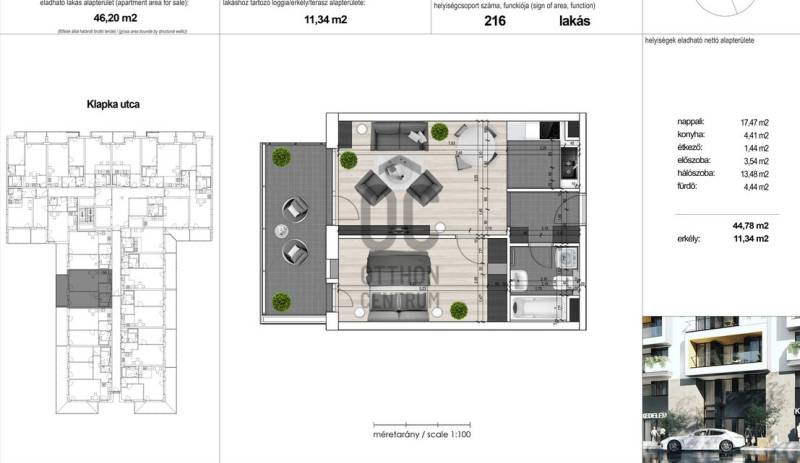 ELADÓ MODERN ÚJ ÉPÍTÉSŰ LAKÁS ERKÉLLYEL – XIII. KERÜLET, KLAPKA UTCABudapest XIII. kerületének egyik dinamikusan fejlődő részén, a Klapka utcában kínálunk megvételre egy kiváló elosztású, új építésű lakást.A 45 m²-es, nappali + 1 hálós elrendezésű ingatlan a 2. emeleten helyezkedik el, praktikus kialakításának köszönhetően ideális választás akár saját célra, akár befektetésnek.A lakáshoz egy 11,34 m²-es erkély tartozik, amely kellemes lehetőséget nyújt pihenésre vagy akár egy kisebb kültéri élettér kialakítására.Az épület modern műszaki tartalommal készül, különlegessége a geotermikus hűtési-fűtési rendszer, amely energiatakarékos és környezetbarát megoldást biztosít, miközben magas komfortérzetet nyújt egész évben.Garázs vásárolható!5% áfa visszaigényelhető!A lakáshoz igény esetén gépkocsibeálló is vásárolható.Műszaki átadás várható ideje: 2026 vége.Ez az ingatlan kiváló lehetőség egy fejlődő környéken, stabil értékállósággal és jó kiadhatósággal.További információért és részletekért keressen bizalommal!