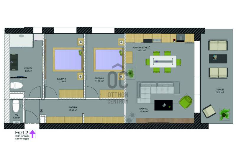 Debrecenben a nyulasi városrészben, igazi nagyerdei környezetben épül egy 6 lakásos, kiemelt műszaki tartalommal tervezett társasház, amelynek exkluzivitása, hogy 3 földszinti lakáshoz saját, kizárólagos használatú kert kapcsolódik, amit a társasház alapító okiratban is külön rögzítenek.A második emeleten pedig egy dupla teraszos penthouse lakás kerül kialakításra.Gépkocsikkal a pinceszinten, saját garázsokban lehet parkolni.További információk:FÖLDSZINT 2. LAKÁS:- 2 szoba + kertre nyíló nappali- 70,61 m2 lakás- 5,89 m2 terasz- 90 m2 saját, kizárólagos használatú kert - gépkocsi tároló igény szerint vásárolhatóA közel nulla energiaigényű épület talajszondás hőszivattyúval, padlófűtéssel és mennyezet hűtés-fűtéssel biztosítja a magas komfortot.- Szerkezet: monolit vasbeton falazat hőszigeteléssel- 3 rétegű nyílászárók (Uw ≤ 0,8 W/m²K)- PIR és XPS hőszigetelés - EV- (elektromos autó) töltési lehetőség minden garázsbanProjekt bemutatásaDebrecen kiemelt kövezetében, a Nyulas városrészben 2027. nyári átadással épülő, új, prémium minőségű lakások eladók!Az alagsorban garázsok, a földszinten kertkapcsolatos lakások, az első emeleten erkélyes - míg a második emeleten egydarab dupla penthouse lakás kapott helyet.A kis lakóközösség exkluzív környezetet kínál, ahol minden lakáshoz önálló használati joggal telekrész vagy terasz vagy erkély, illetve zárt garázs tartozik.A lakások 50 és 118 m² közötti méretűek, funkcionálisan átgondolt alaprajzokkal és kiváló benapozottsággal.A részletes műszaki tartalomról a konkrét ingatlanok oldalán tájékozódhat, vagy telefonon a hét minden napján várjuk hívását!