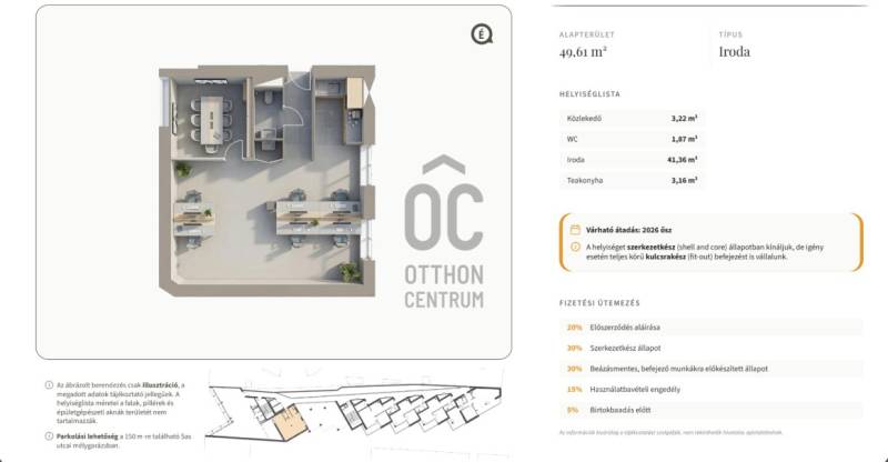 MODERN IRODA DEBRECEN BELVÁROSÁBANHatékony munkatér, prémium környezetben!Debrecen központjában megvalósuló, modern, vegyes funkciójú társasház 1. emeletén kínálunk eladásra új építésű, prémium irodát, kiváló lokációval és korszerű műszaki tartalommal.IRODA PARAMÉTEREI- Teljes alapterület: 49,6 m²- Irodatér: 41 m² (jól alakítható, egyterű)- Közlekedő: 3 m²- Teakonyha: 3 m²- WC: 2 m² Ideális kisebb cégnek, szolgáltató irodának vagy befektetésnek!- 1. emeleti elhelyezkedés – könnyű megközelítés- Liftes épület- Letisztult, modern belső terek- Nagy, világos irodatér PRÉMIUM MŰSZAKI TARTALOM- Talajszondás hőszivattyús rendszer- Fan-coil hűtés + korszerű fűtés- 3 rétegű hő- és hangszigetelt nyílászárók- Motoros zsaluzia árnyékolás- Energiahatékony működés ELHELYEZKEDÉS- Belvárosi, frekventált lokáció- Közvetlen közelben szolgáltatások, vendéglátás- Jó megközelíthetőség- Üzleti szempontból ideális környezetLEHETSÉGES FUNKCIÓK pl:- ügyvédi iroda- könyvelő / tanácsadó iroda- startup / kreatív stúdió- rendelő vagy szolgáltató egységEz az iroda egy kompakt, modern és energiahatékony munkatér, amely:- kiváló lokációval- jól használható alaprajzzal- prémium műszaki háttérrelbiztosít stabil alapot bármilyen üzleti tevékenységhez.Érdeklődj most, és indítsd el vállalkozásodat egy valóban profi környezetben!Projekt bemutatásaDebrecen központjában modern társasházban kínálunk magas műszaki tartalmú, új építésű, prémium minőségű, okos otthonokat!Prémium műszaki tartalom: Okosotthon vezérlés:A SmartNode okosotthon rendszerrel a fűtés, hűtés és árnyékolás távolról is egyszerűen vezérelhető, energiatakarékos működéssel.Személyre szabható hőkomfort:Fan-coil rendszerrel szabályozható fűtés és hűtés, valamint egyenletes hőeloszlást biztositó padlófutés az egész lakásban.Víz–víz hőszivattyú:Talajszondás megoldás, amely megújuló energiával biztosítja a gazdaságos fűtést és hűtést.Napelemes rendszer:Napelemekkel támogatott energiaellátás a fenntartható működés és alacsonyabb költségek érdekében.Motoros zsalúzia:Okosotthon rendszerrel vezérelhető, automatizált árnyékolás a nagyobb komfort és az energiahatékony működés érdekében.Riasztó előkészítés:Előkészített rendszer a biztonságos, könnyen telepíthető riasztóhoz.Videó kaputelefon:Modern beléptető rendszer videós azonosítással a biztonság érdekében.Személyfelvonók:Két lift, köztük nagy teherbírású felvonó a kényelmes használatért.Főbb jellemzők:32 db lakás (nappali + 1 vagy 2 szoba)5 emeletes, liftes épület (2 lift)Zöldtető és modern homlokzat1 vendéglátó egység + 6 iroda Kényelem és elhelyezkedés:Földszinti lakásokhoz privát kertkapcsolatKerékpártároló a telken belülParkolás közeli mélygarázsbanBelvárosi lokáció – minden karnyújtásnyira Ideális választás saját otthonnak vagy befektetésnek is, ahol a modern technológia és a kiváló elhelyezkedés találkozik.Érdeklődj most, és válaszd ki új otthonodat elsőként!