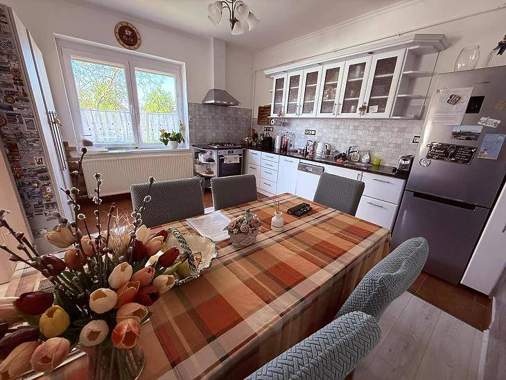 Eladásra kínálunk Fót közkedvelt részén, Kisalagon egy 170 nm-es, jó állapotú, szigetelt családi házat 1219 nm-es telken. Az ingatlan két külön bejáratú, de igény szerint egybenyitható lakóegységből áll, így ideális több generáció együttélésére vagy befektetésnek is.A felső lakás kb. 105 nm, tágas nappalival, 2 hálószobával beépített szekrényekkel, külön gardróbbal, konyha-étkezővel és kádas-zuhanyzós fürdővel. Műanyag, dupla üvegezésű nyílászárók szúnyoghálóval, részben elektromos redőnyökkel, 2 klíma (ebből egy 3,5 kW-os), a fűtést Ariston kondenzációs kazán biztosítja.A külön bejáratú alsó lakrész kb. 65 nm, előszobával, nappalival, hálószobával, konyha-étkezővel és zuhanyzós fürdővel rendelkezik. A nyílászárók itt is dupla üvegezésűek, szúnyoghálóval és elektromos redőnnyel felszereltek. Fűtése kondenzációs és vegyestüzelésű kazánnal megoldott.A ház alatt 1 autós garázs (elektromos autó töltés kialakítható), valamint egy kb. 24–25 nm-es szuterén található, továbbá a telken több kerti beálló is rendelkezésre áll. Az ingatlanhoz tartozik egy kb. 30 nm-es, szigetelt melléképület vizesblokkal és külön szobával, valamint egy további 30 nm-es tároló.A ház alsó szintje 1978-ban, a felső az 1990-es években épült, folyamatosan karbantartott, jó állapotú. Részben réz villanyvezetékekkel, 3×16 fázissal rendelkezik. A víz és villany közös, a gáz részben külön rendszerről működik. D-i fekvésének köszönhetően egész nap világosak a terek.Az elhelyezkedés kiváló: az M2 autóút 2 percen belül elérhető, a Volán buszmegálló pár perc sétára található. A közelben üzletek, orvosi rendelő, cukrászda, iskola, óvoda, gyógyszertár és egyéb szolgáltatások is megtalálhatók.